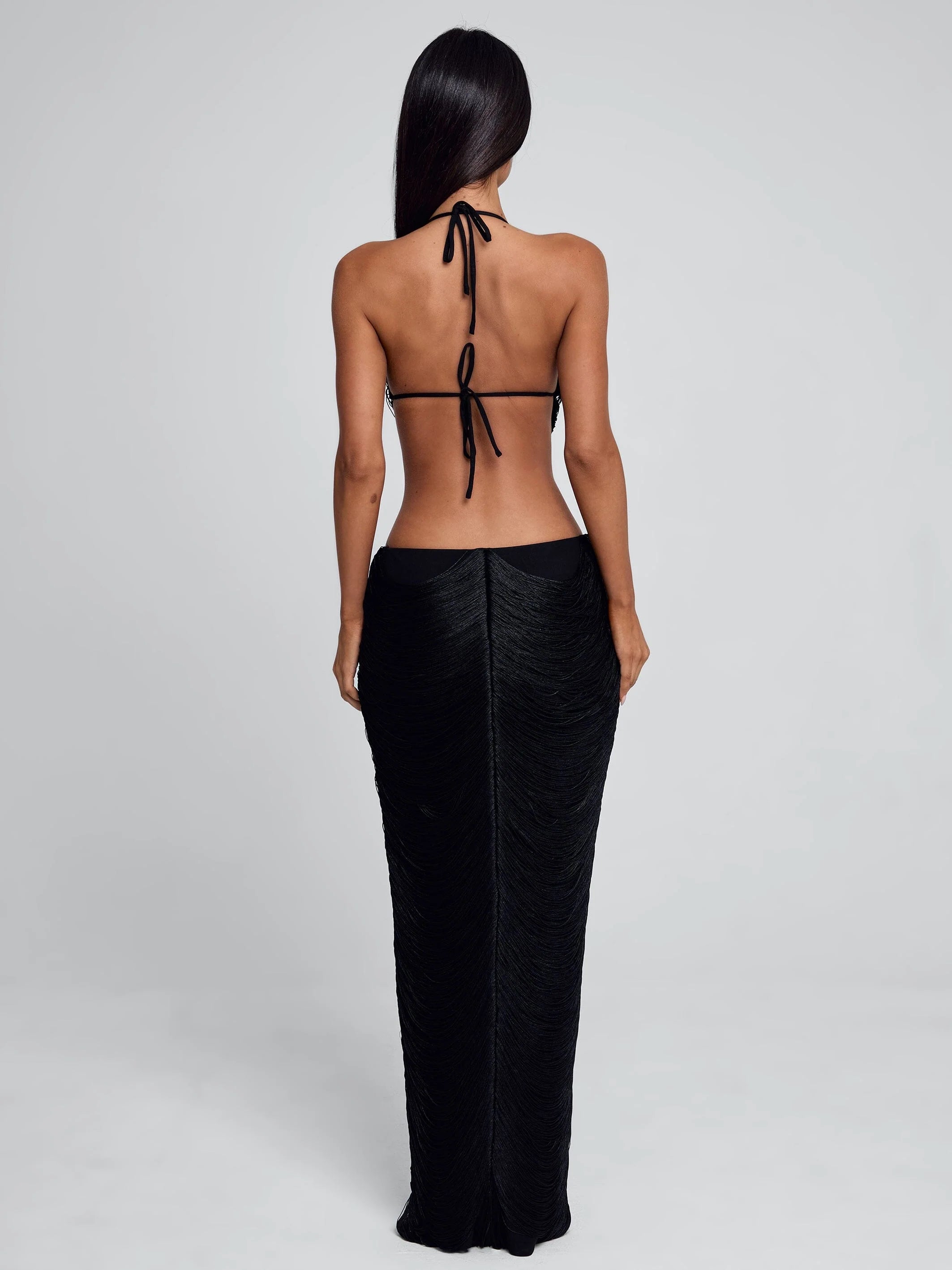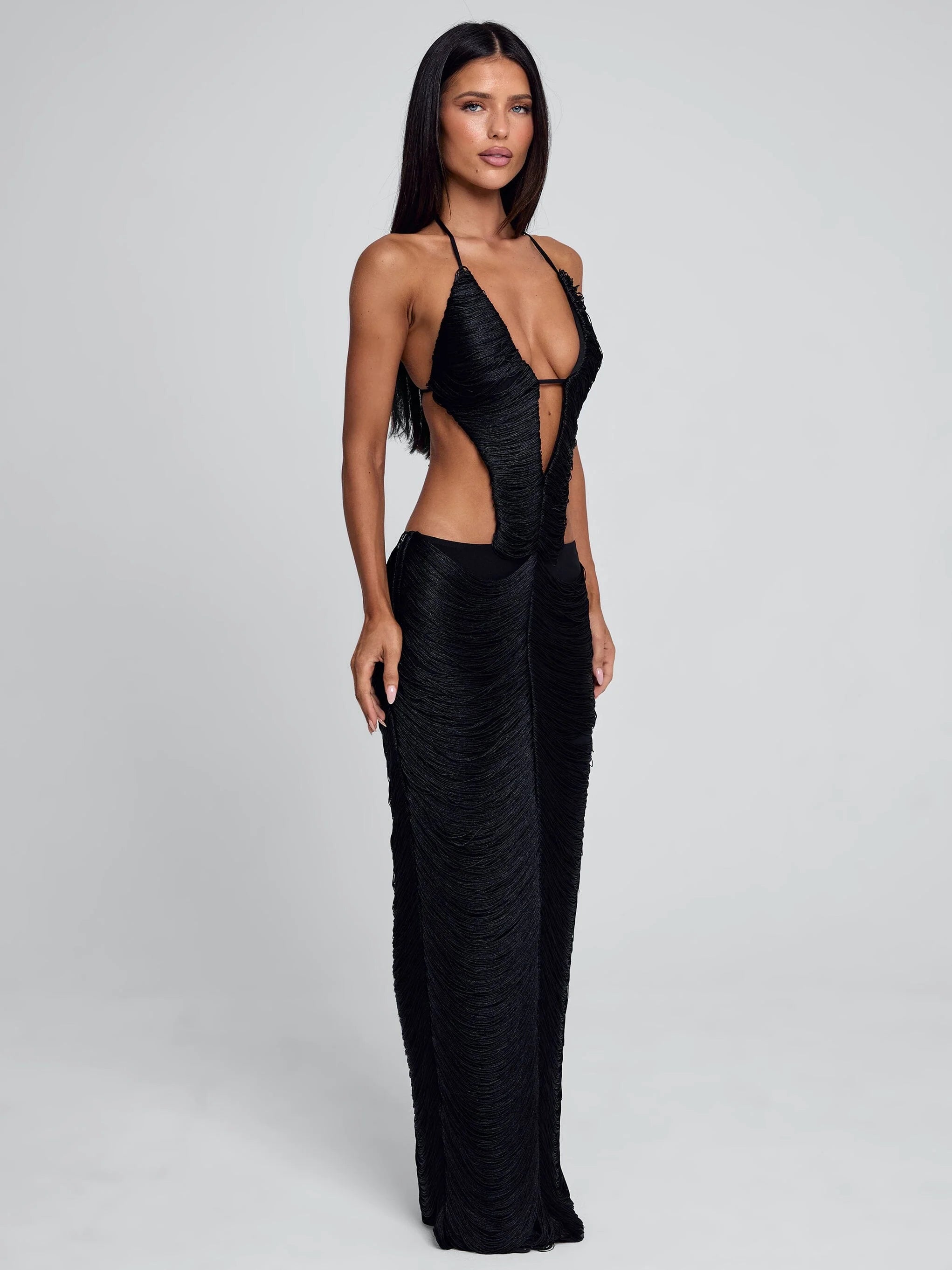 Crafted from a power mesh base layered with cascading fringe, she moves effortlessly with the body while sculpting your silhouette in a flattering body-con fit. The cut-out design and open back add a daring edge, balanced by adjustable neck and back ties for the perfect fit. Finished with a back zip closure for ease.