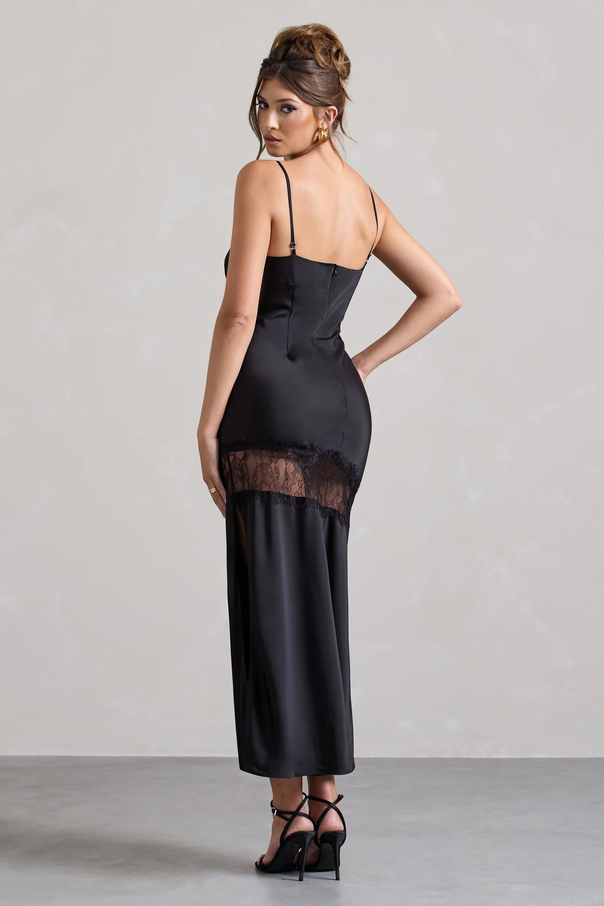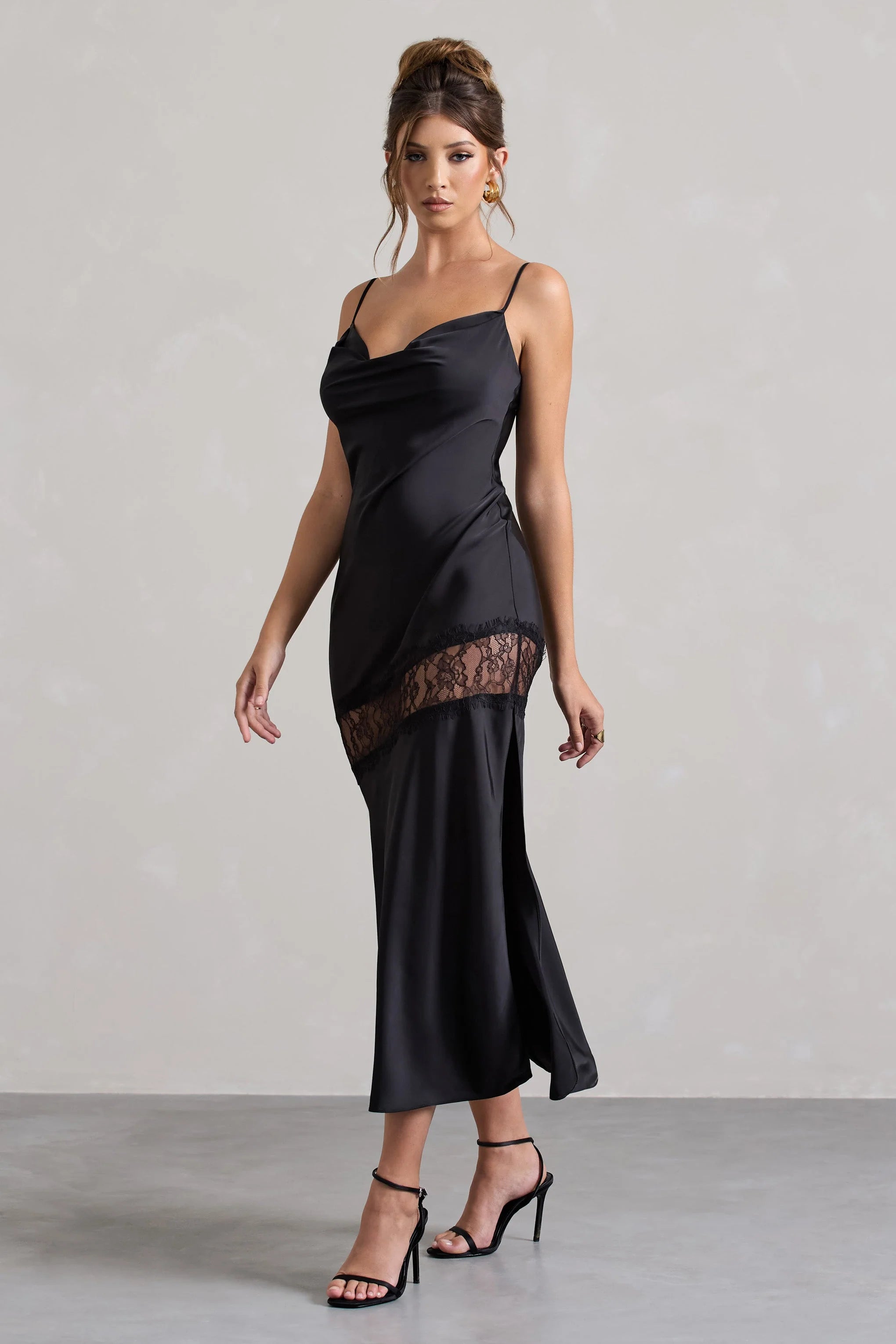 Turn your attention to Matera, the perfect maxi for wedding guest season. Arriving in a classic black shade of our premium flowing satin that drapes over your curves and boasts a feminine cowl neckline. Matera is detailed with an elegant lace panel, style yours with a tousled bun and some strappy stilettoes for your next occasion.
