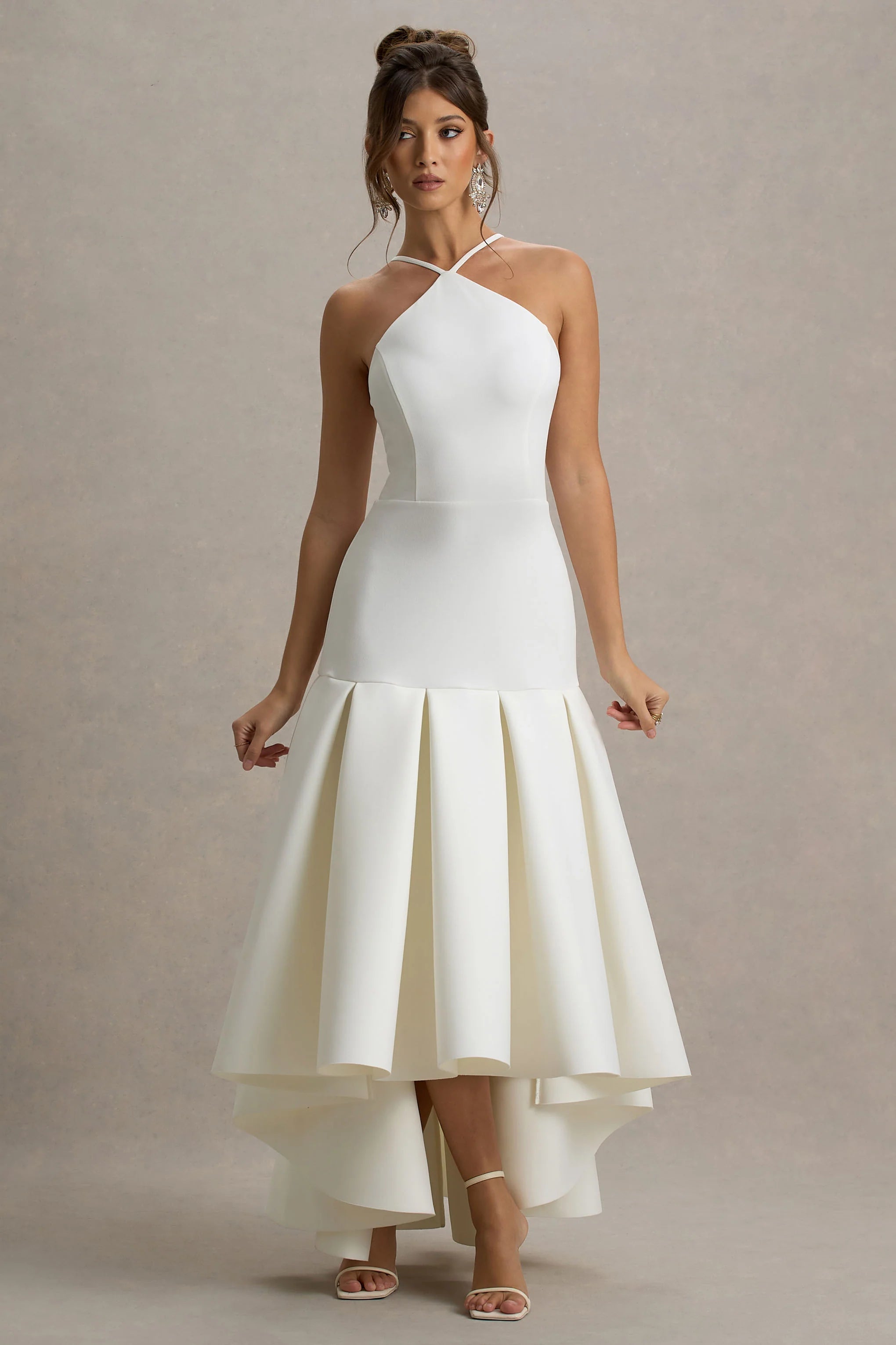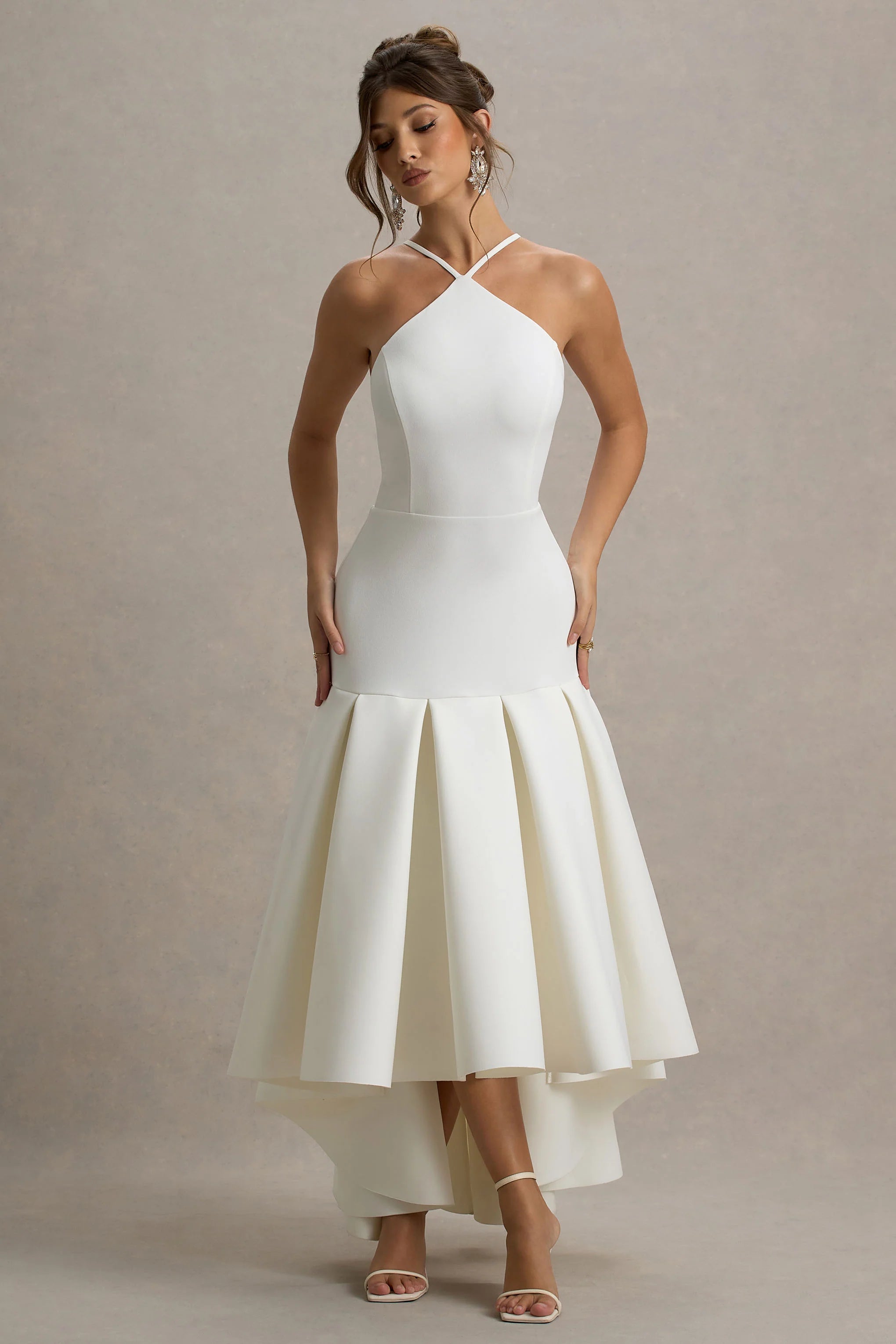 Look effortlessly chic in our latest maxi, Mavis, a seamless blend of class and style. Curated in a soft cream shade of our premium scuba crepe, this one-piece graciously sculpts your curves before cascading into a detailed, plated skirt. The halter neckline delicately frames your shoulders, adding feminine structure to this head-turning piece. Style all season-long, from ladies brunches to sunset dinners, paired with gold accessories to tie the look together.