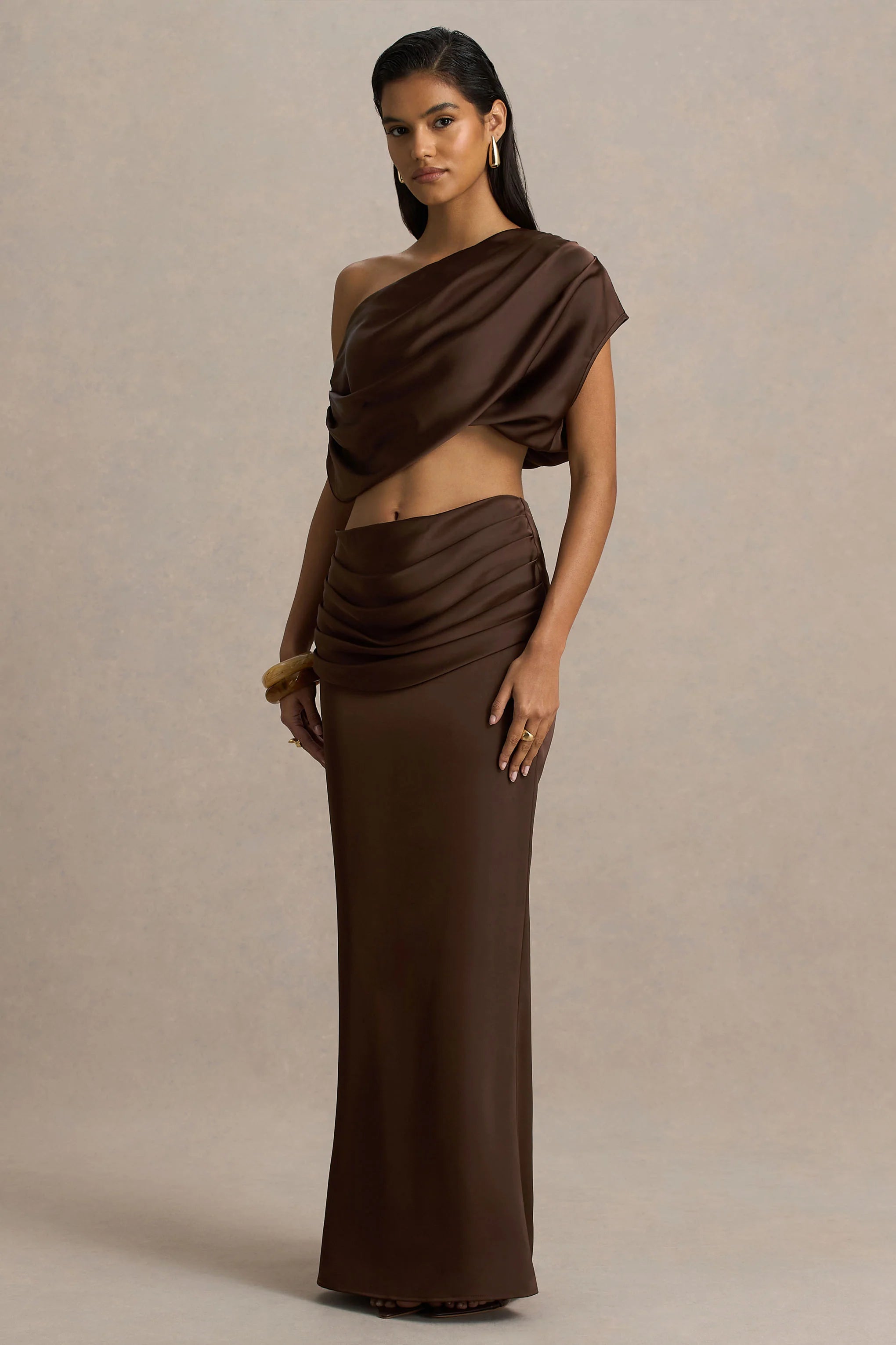 Sleek, sultry, and made to stand out- Megan brings effortless elegance to your wardrobe. Crafted from our premium brown satin in a flowing maxi length, this skirt glides over your curves with a lustrous finish. The asymmetric waistline adds a modern edge, creating a flattering silhouette that catches every eye. Style it with our Entrapment top for the full co-ord moment that’s made to turn heads.