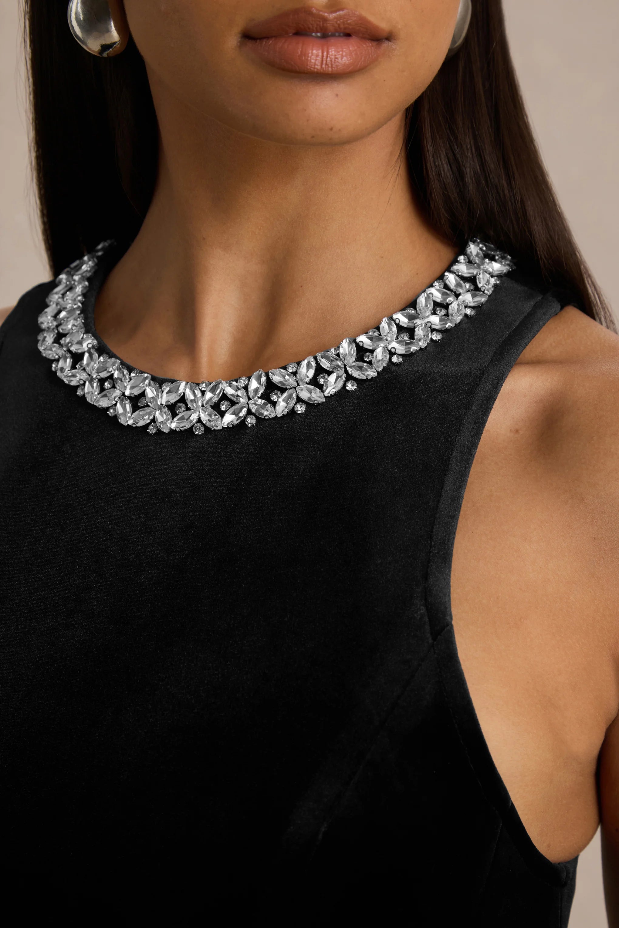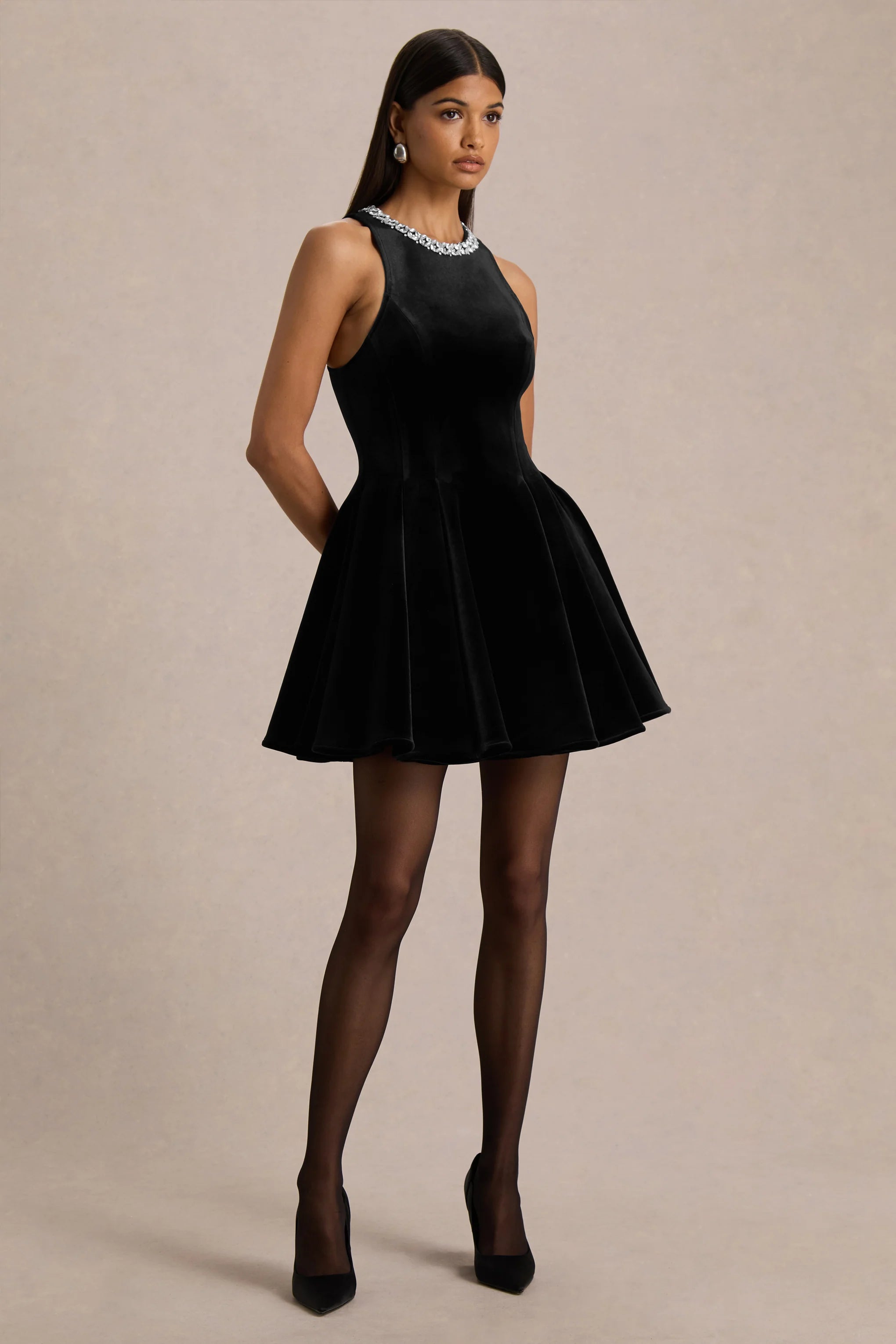 Turn heads in Meva, the perfect party-ready mini for nights that call for effortless glamour. Crafted in a rich black hue of our premium velvet, this mini dress combines elegance with a flirty silhouette. Featuring a halter neckline adorned with sparkling hand-embellishments and a playful skater skirt, it’s designed to move with you and make every entrance unforgettable.