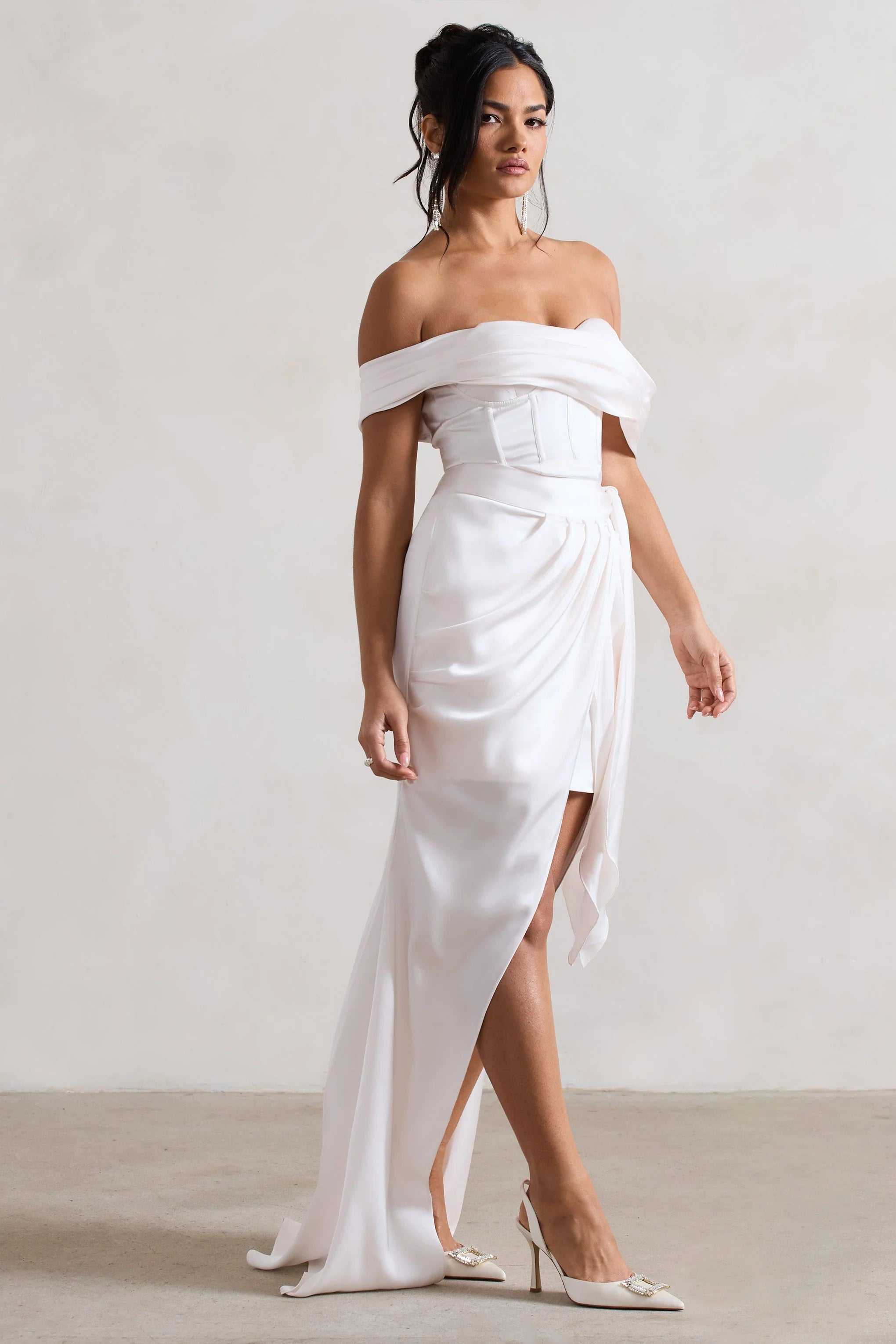 Offering a blend of classic and contemporary, our Milano maxi exudes sophistication. Arriving as a set, this versatile style boasts a satin mini dress equipped with wired padded cups and boned corset bodice for a curve-enhancing fit. Complete with a removable satin wrap skirt, Milano is the perfect pick for any event from hen to aisle.