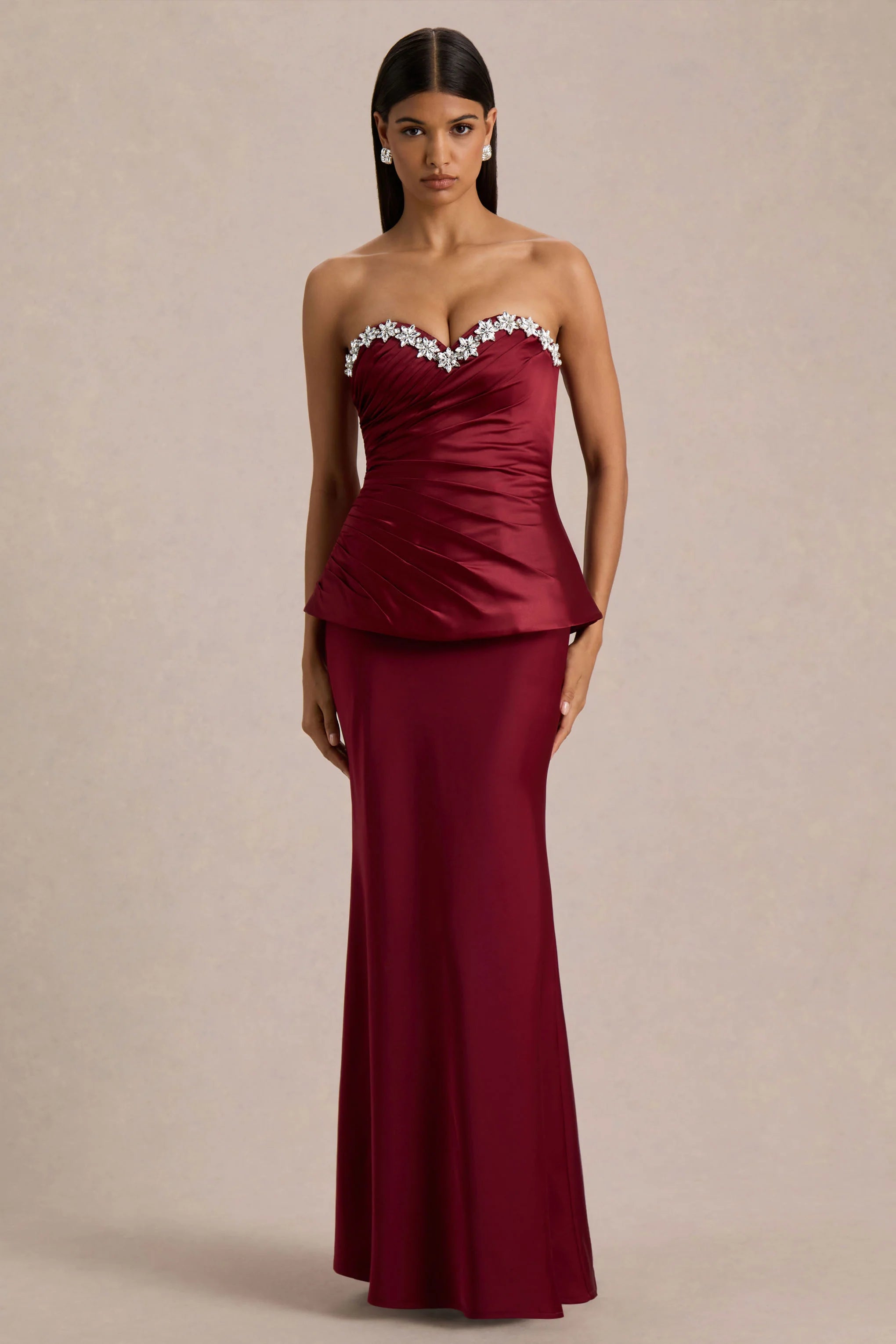Say hello to Millia, the maxi dress that exudes timeless glamour. Crafted from our premium burgundy satin, this floor-skimming silhouette flatters the figure with elegant drape and movement. The hand-embellished sweetheart neckline brings a touch of sparkle, while the corset bodice and gathered detailing enhance a flattering, feminine shape. Sleeveless and effortlessly chic, Millia is your go-to for black tie moments.