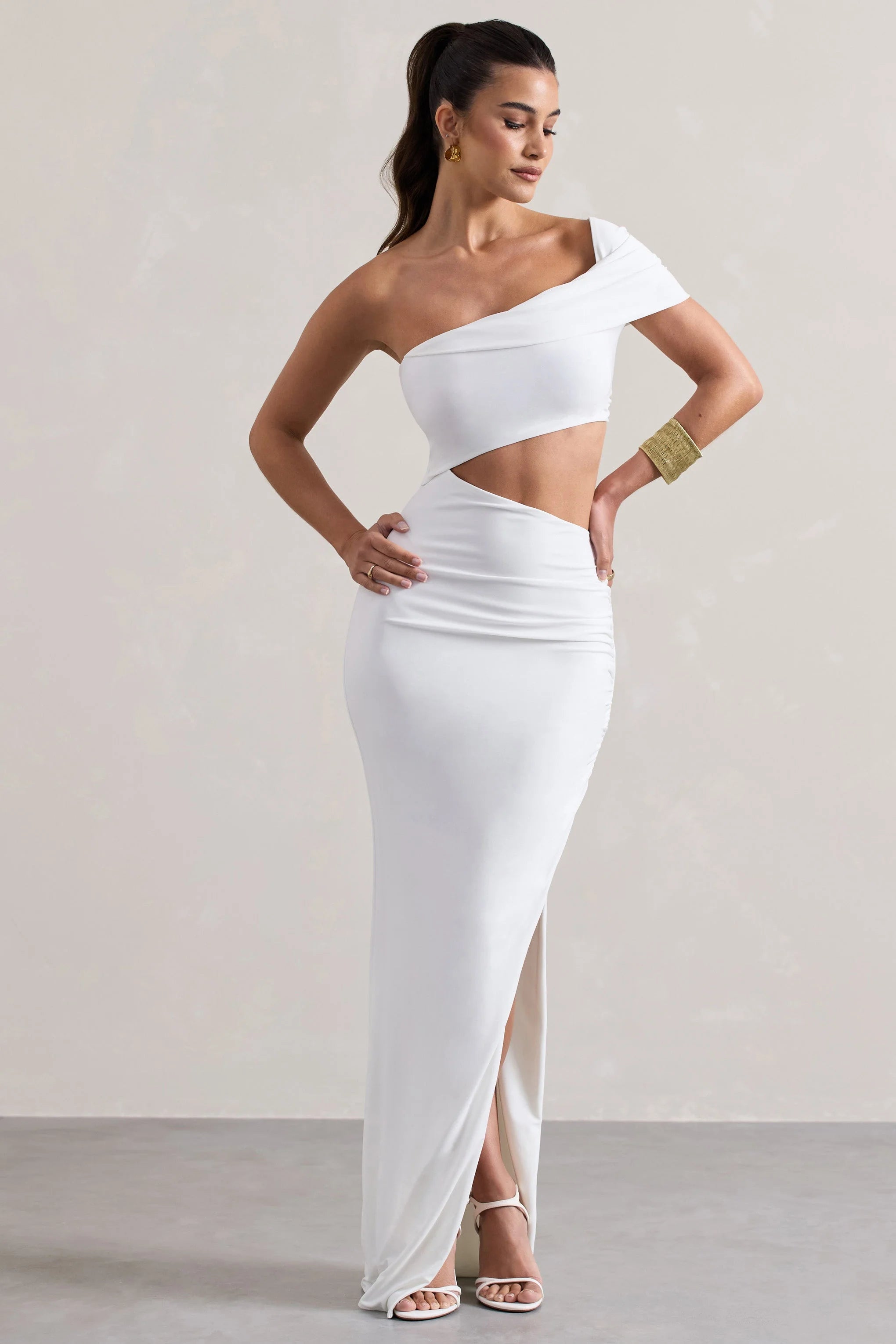 Time to get out of office ready in our latest maxi dress, Milos. Arriving in our signature stretch jersey in a bright white this maxi has been cut in a refreshing silhouette for sunnier evenings. Boasting an asymmetric one shoulder neckline and flattering bodice cut-out, style this split maxi with some strappy sandals for sunset cocktails.