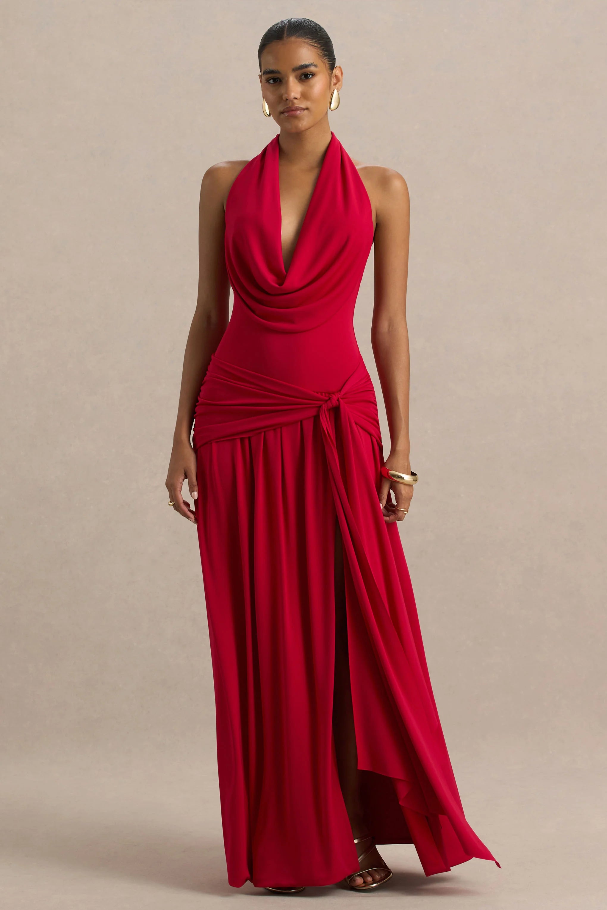 Captivate the room with your elegant energy in Mist. Crafted from our premium solton, in a rich red shade, this maxi is the ultimate head-turner for your next dressed up moment. Featuring a striking plunge neckline with delicate draping and a front high split, this dress strikes a perfect balance of sultry and chic. The wrap waist that cascades into a gorgeous sash, effortlessly cinches and sculpts your silhouette. Make a bold statement by pairing Mist with a sleek clutch and gold jewellery for your next special occasion.