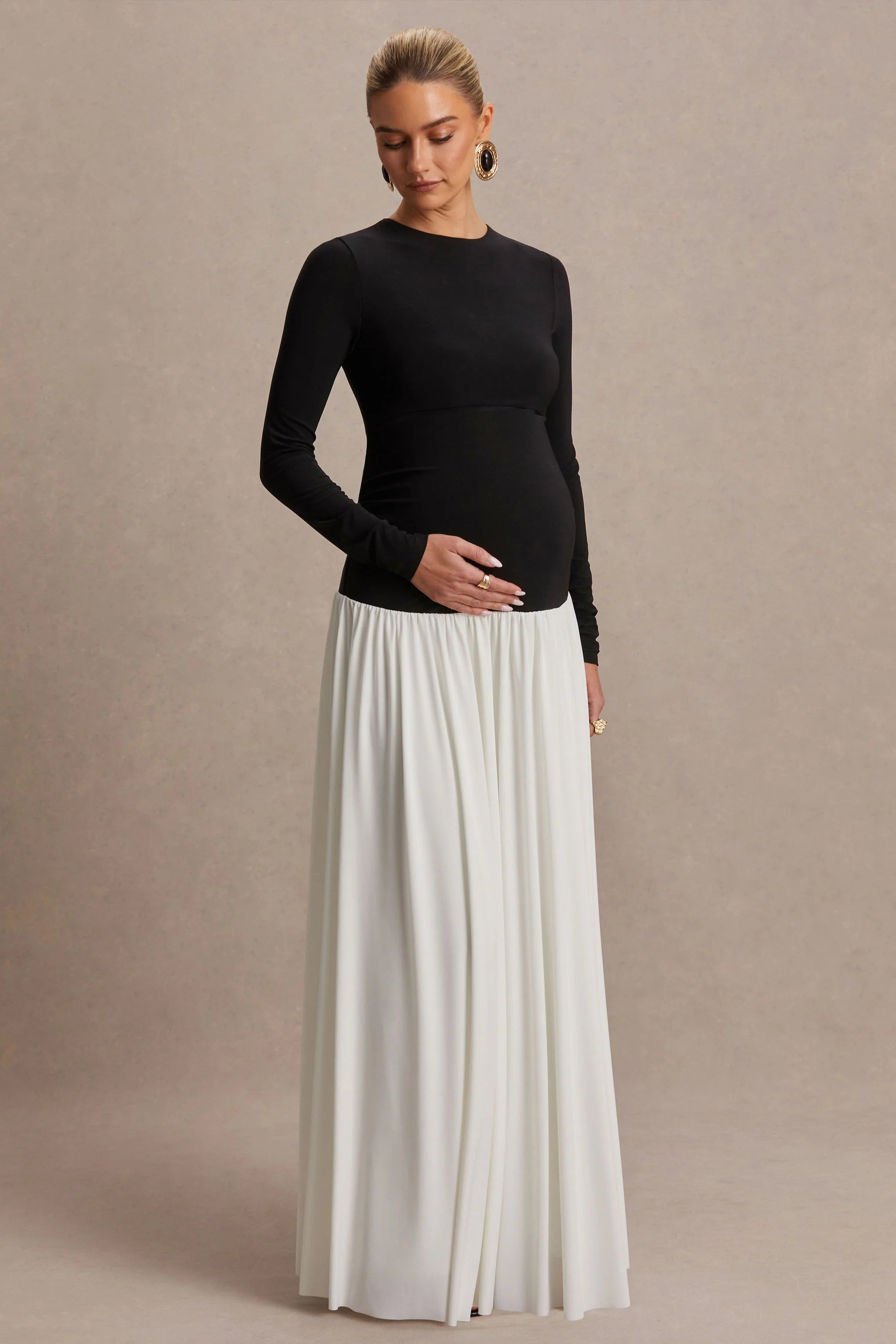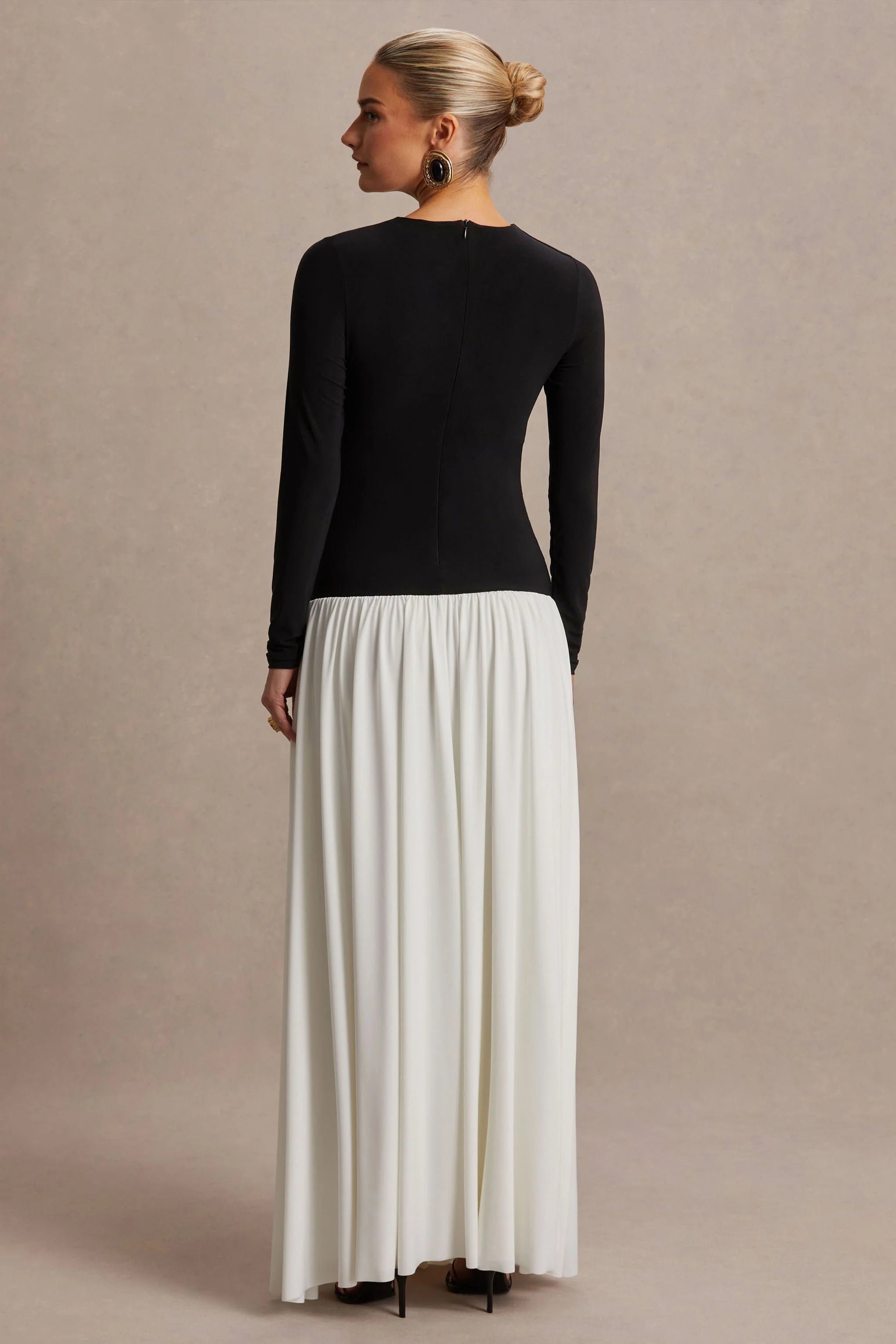 Step into refined elegance with the Monroe, a dress designed to make every occasion memorable. Crafted in a rich contrast of black and white shades of our premium stretch jersey, its maxi length and figure-flattering fabric glide effortlessly over the body. Featuring a classic crew neckline, a chic drop waist, and a flowing pleated skirt, this dress combines timeless tailoring with graceful movement. Perfect for special events, Monroe exudes sophistication with effortless style.