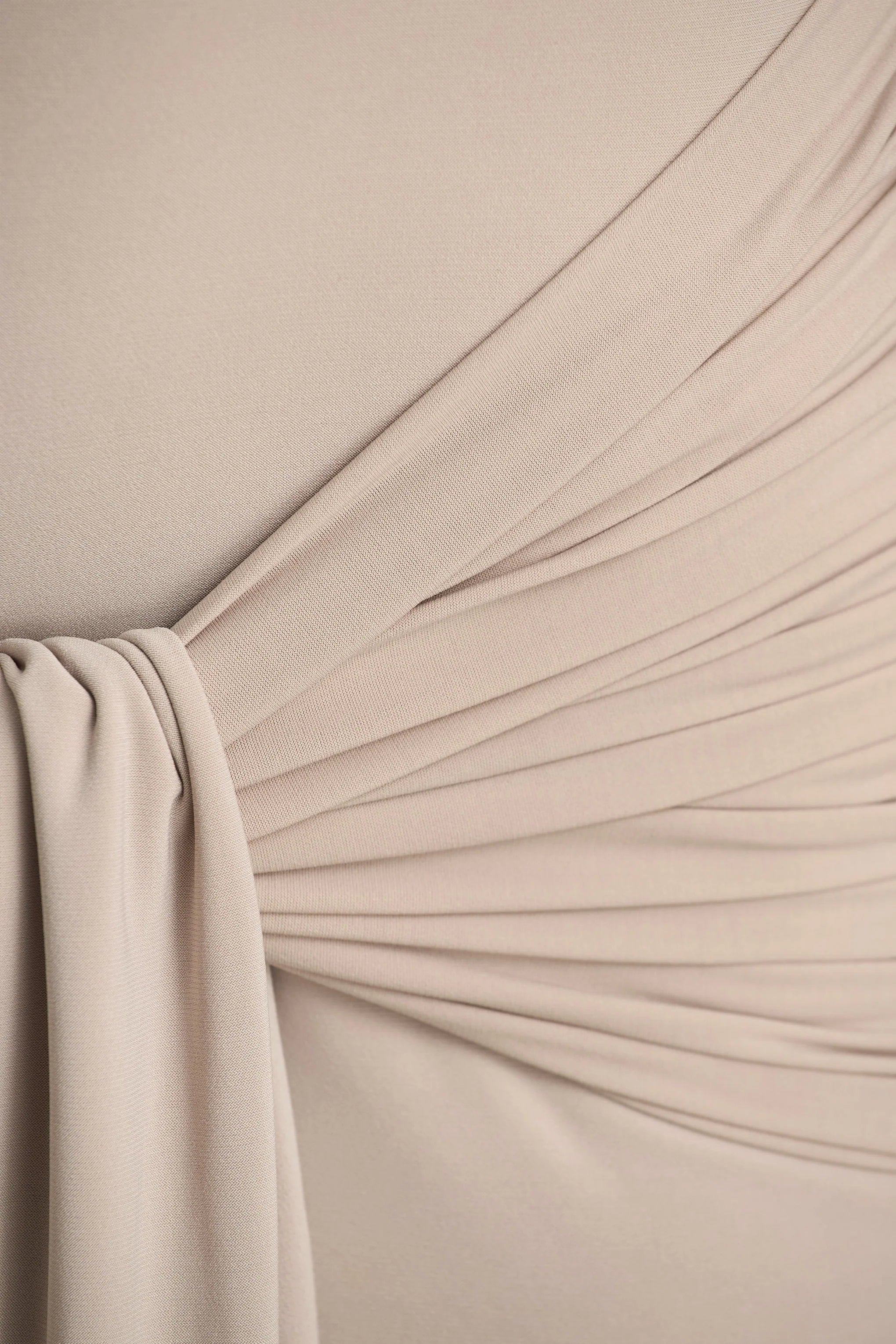 Timeless glamour with a modern edge, Myra is the ultimate showcase of understated drama. Crafted in our contouring premium jersey in a rich champagne hue, this maxi dress is designed to make an entrance. Featuring a high neckline and a flattering drop waist, Myra balances sophistication with sultry detail. The self-tie waist cinches your silhouette to perfection, while the cascading sash elongates the figure with graceful movement. Finished with delicate ruching to sculpt your curves, this look is made to leave a lasting impression.
