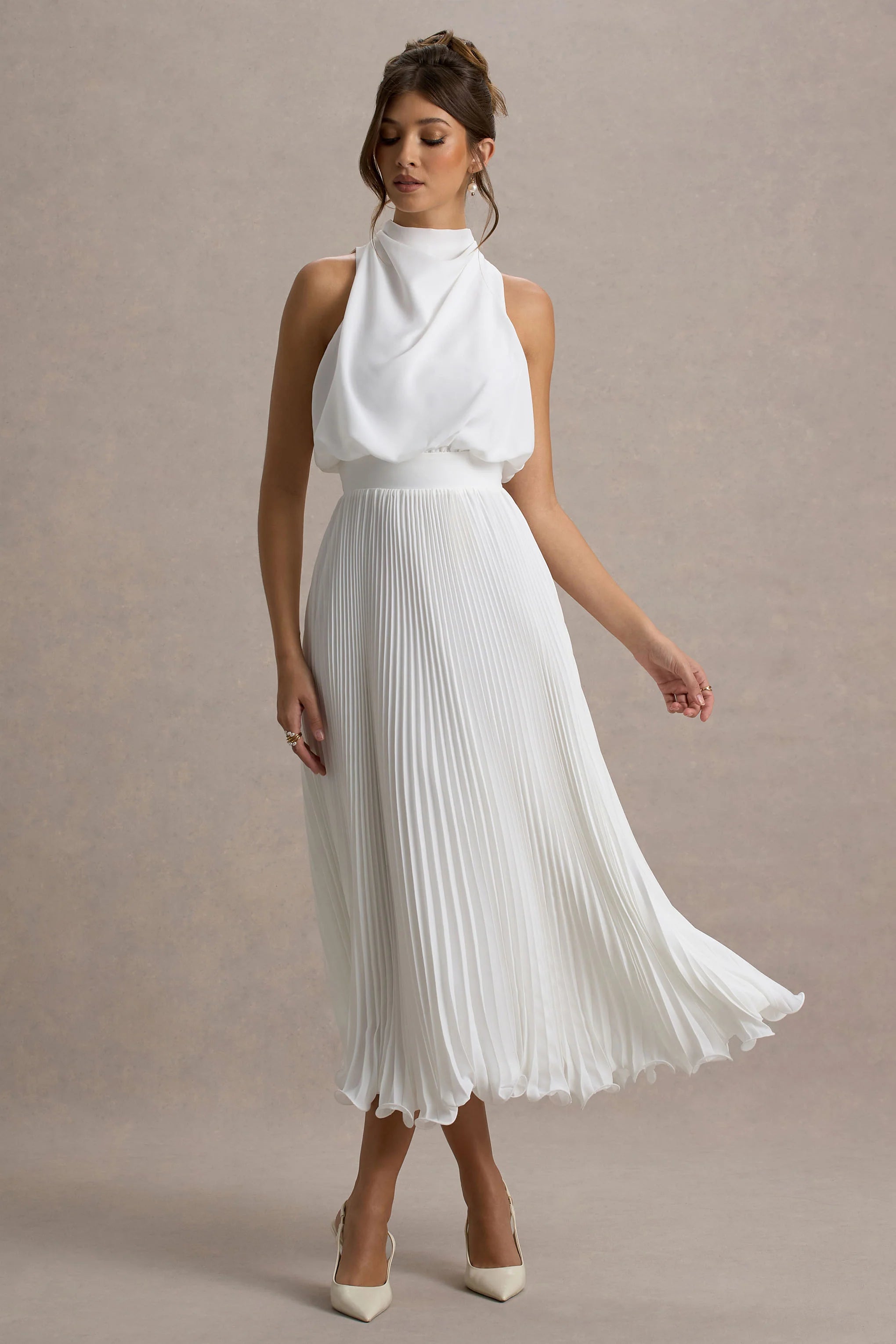 Simple yet graceful, Nila was made to see you through any occasion. Designed in a crisp white shade of our premium chiffon, this elegant midi dress boasts a demure high neckline, subtle cowl detailing and a flattering cinched waist. Compliment Nila's plisse skirt with some eye-catching stilettos like Bowing.