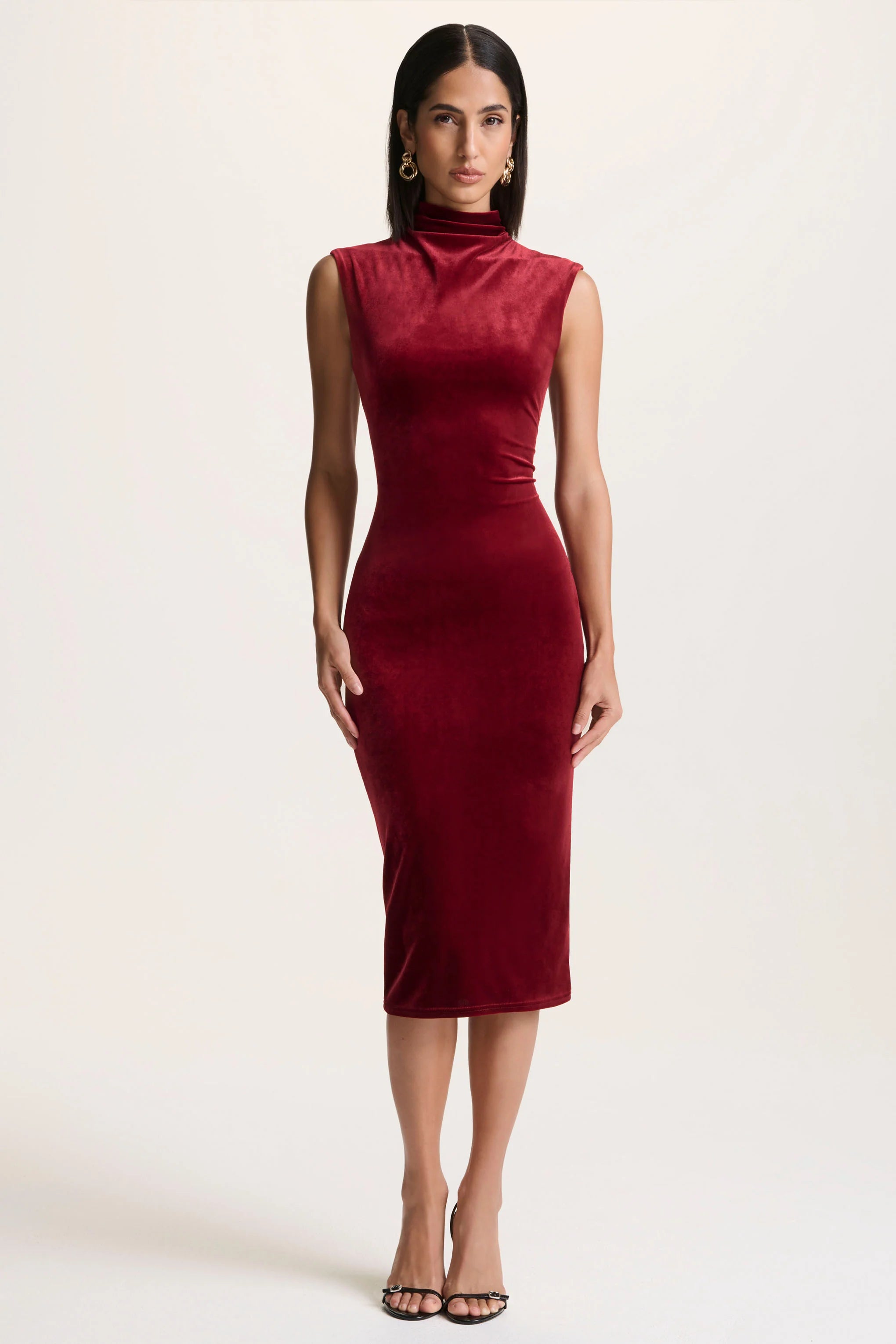 Nivina is the embodiment of timeless elegance. Crafted from our premium velvet in a deep red hue, this midi-length design skims the silhouette with refined simplicity. The high neckline and sleeveless cut create a sleek, sophisticated shape, and a seamless finish. Nivina is perfect for those who appreciate understated glamour and classic evening style.