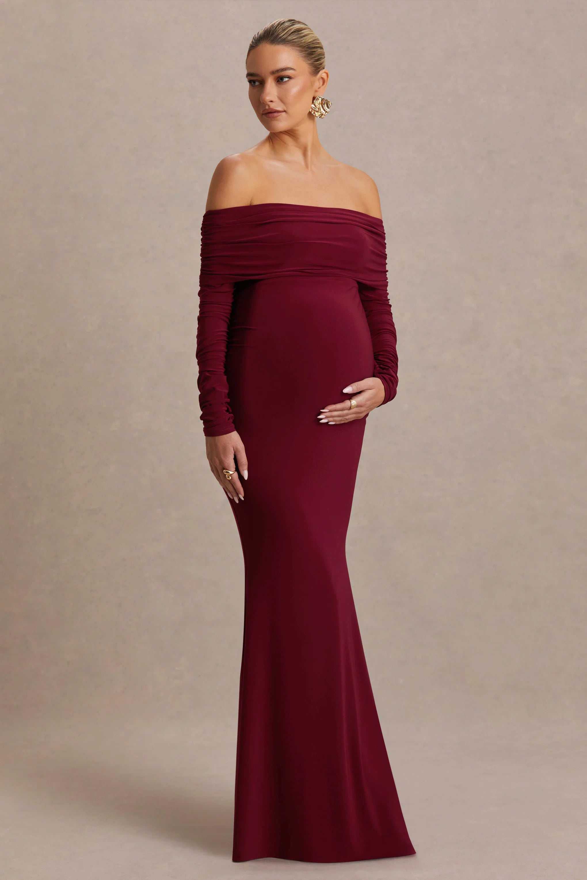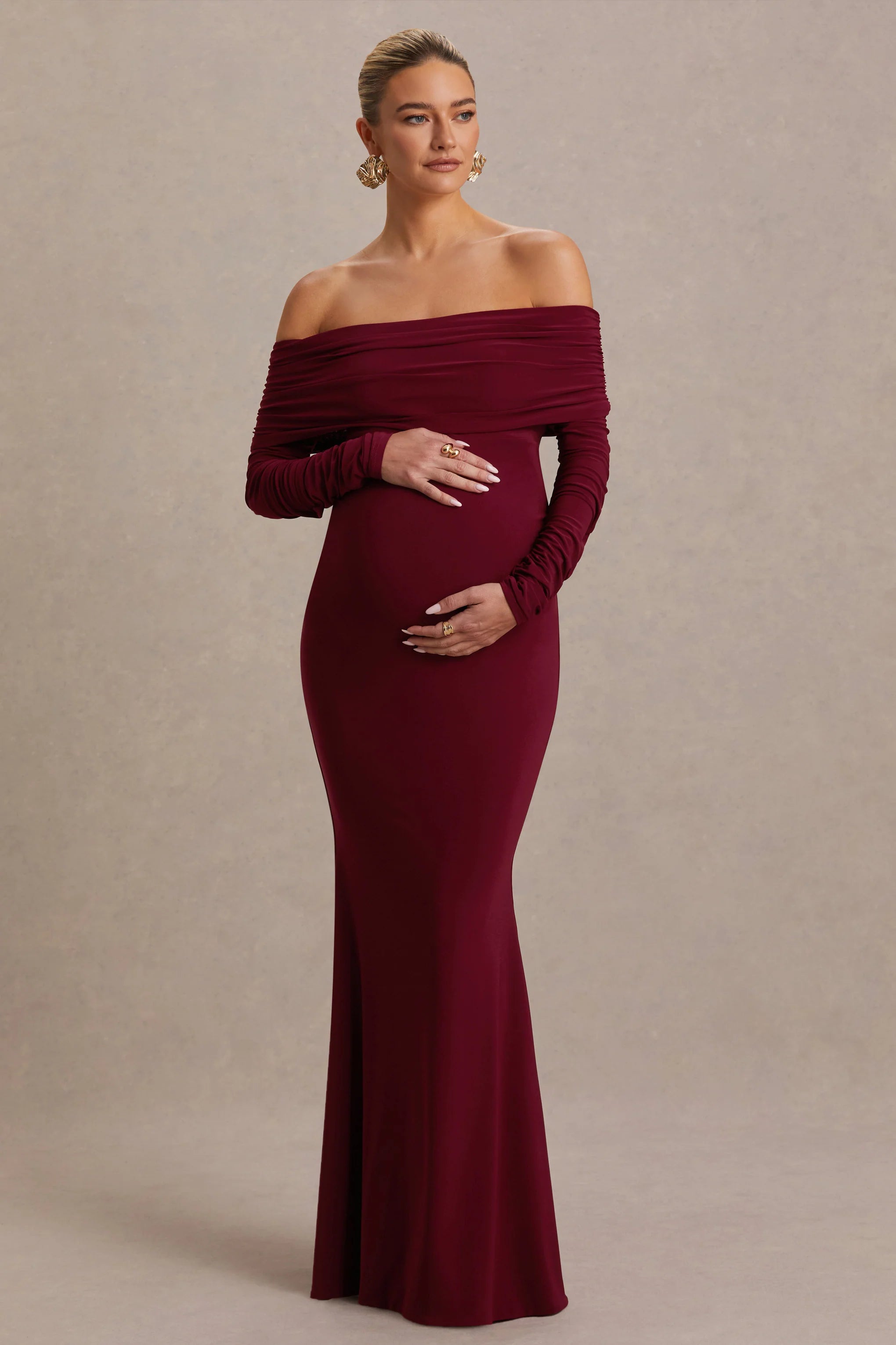 Introducing Odessa, the epitome of sleek sophistication. Designed in our premium stretch jerseyfor a flawless fit this berry hued maternity maxi dress flatters from all angles. Features a romantic bardot neckline, ruched detailing to flatter every curve, and elegant long sleeves, this maxi silhouette is timeless yet striking. Odessa is the perfect choice for evenings that call for confidence and glamour.