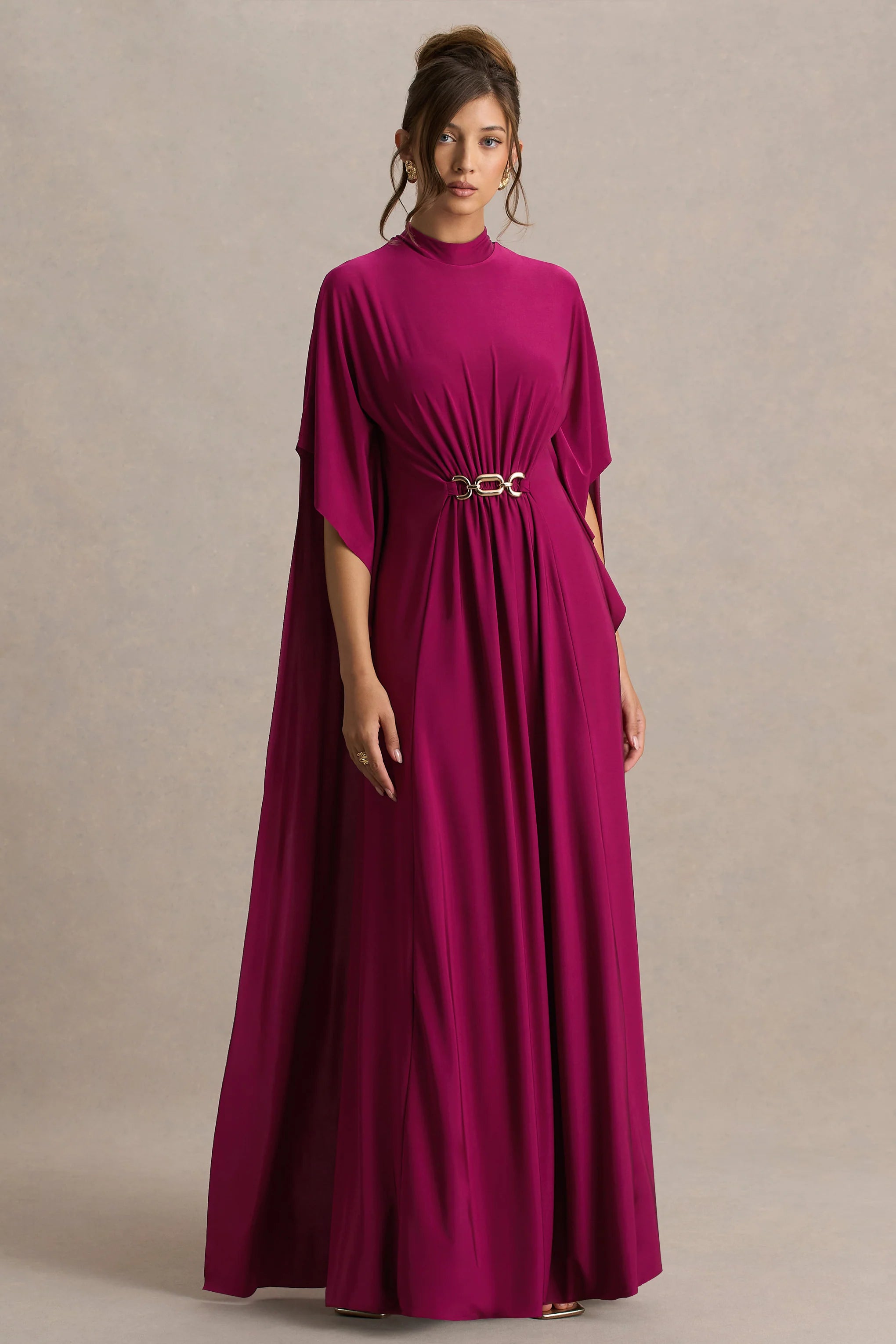 Defined by its flowing silhouette and dramatic details, Olessia is a striking option for your next special occasion. Crafted from our premium disco jersey, this burgundy maxi dress features gathered cape sleeves that add a bold, elegant touch. The belted waist cinches your figure, enhancing the fluid design for a flattering fit. Perfect for evening events or formal affairs, keep Olessia in focus with sleek accessories and strappy heels for a look that effortlessly combines sophistication and drama.