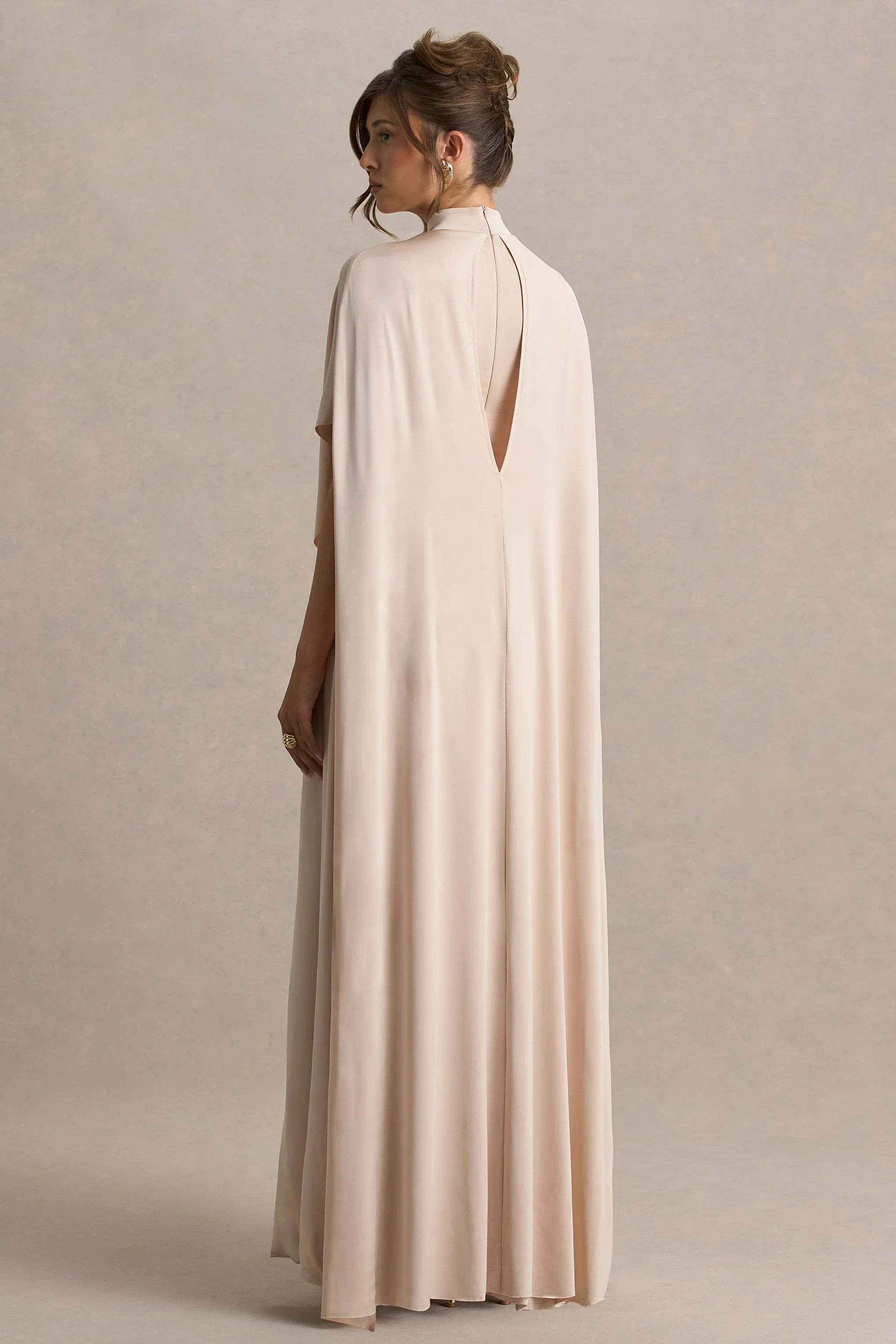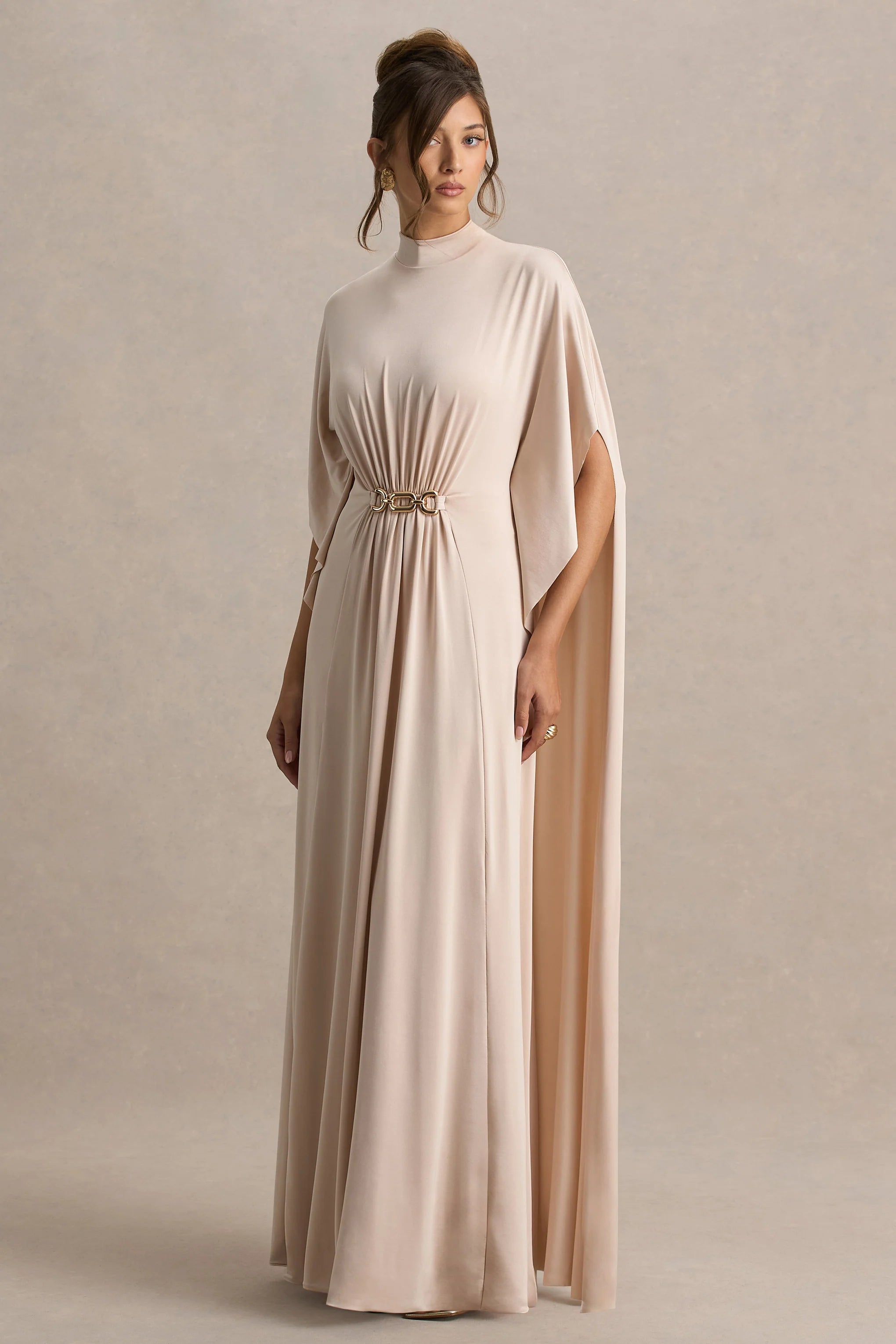 Defined by its flowing silhouette and dramatic details, Olessia is a striking option for your next special occasion. Crafted from our premium disco jersey, this champagne maxi dress features gathered cape sleeves that add a bold, elegant touch. The belted waist cinches your figure, enhancing the fluid design for a flattering fit. Perfect for evening events or formal affairs, keep Olessia in focus with sleek accessories and strappy heels for a look that effortlessly combines sophistication and drama.