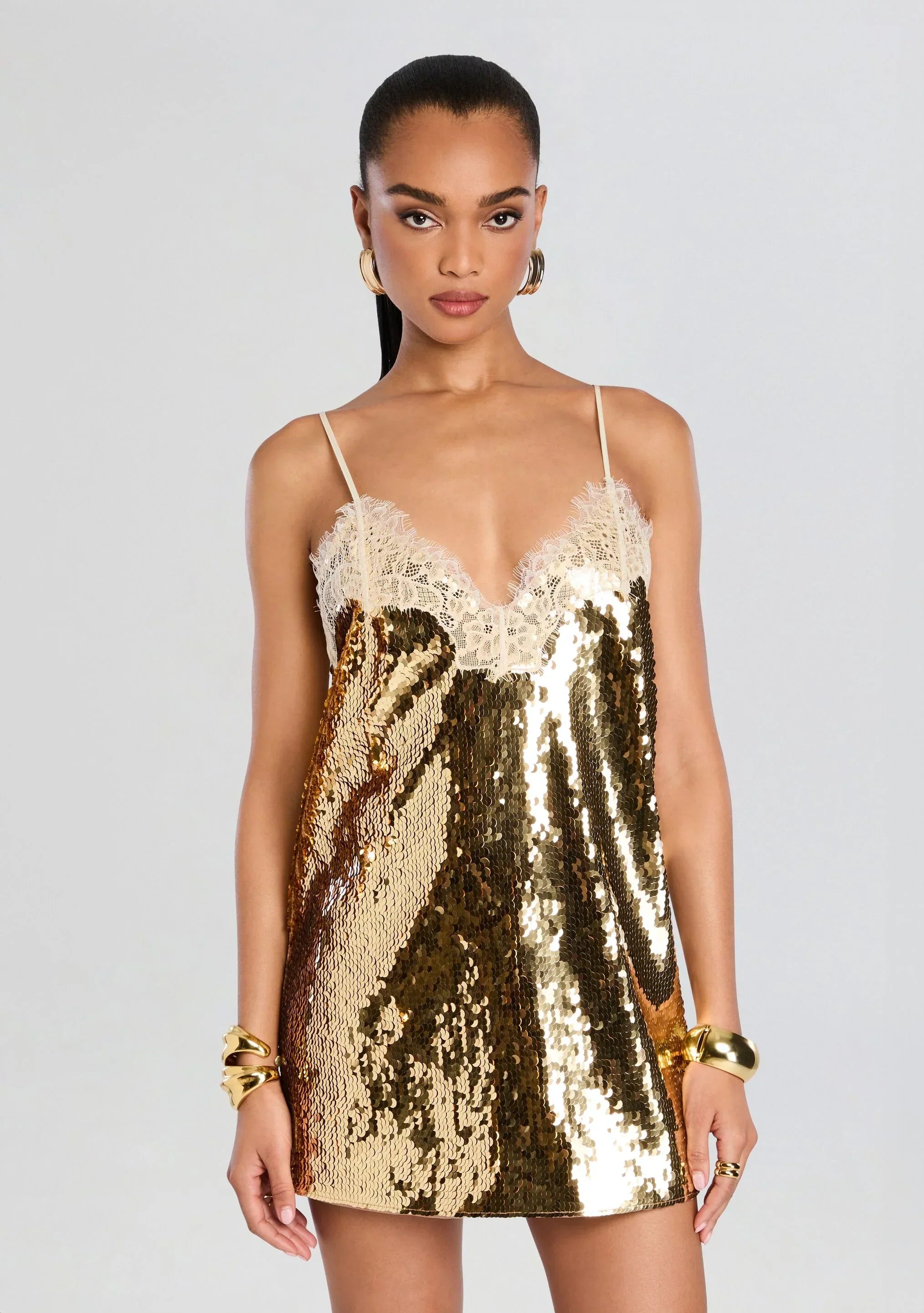 Radiate elegance in our Olive Dress. This luxurious cocktail dress features a delicate lace bodice with a flattering, all over sequin silhouette. The adjustable straps ensure a perfect fit, while the flowing silhouette creates a graceful and feminine look. Shown here in Gold.
