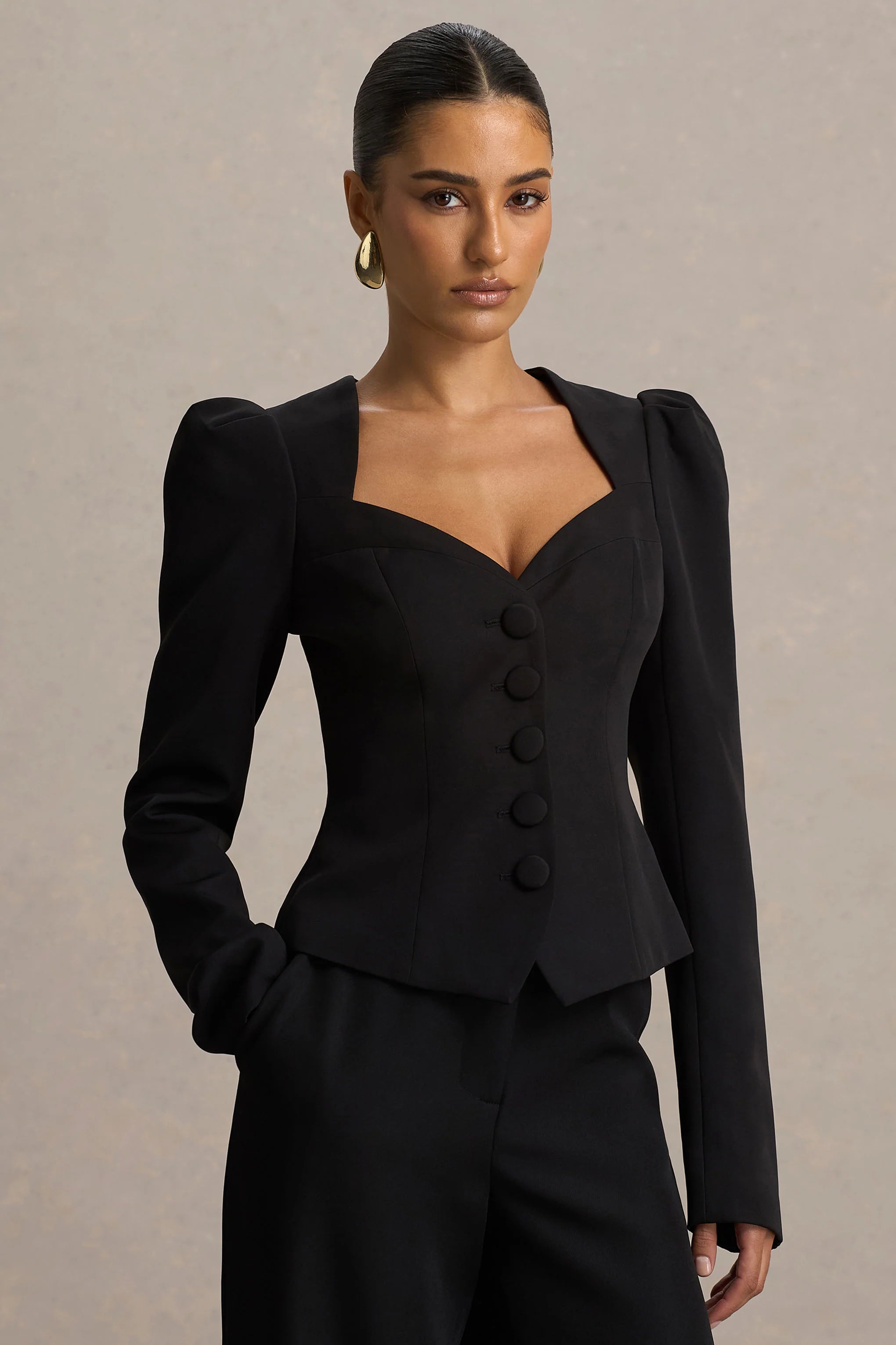 Olympia turns up the charm with effortless elegance and bold femininity. Cut from our premium black crepe, this structured style flatters y ourfigure with its tailored silhouette and soft, curve-enhancing details. Finished with a sweetheart neckline, long sleeves, and functional self-covered buttons, Olympia is the perfect piece to take you from polished days to elevated evenings.