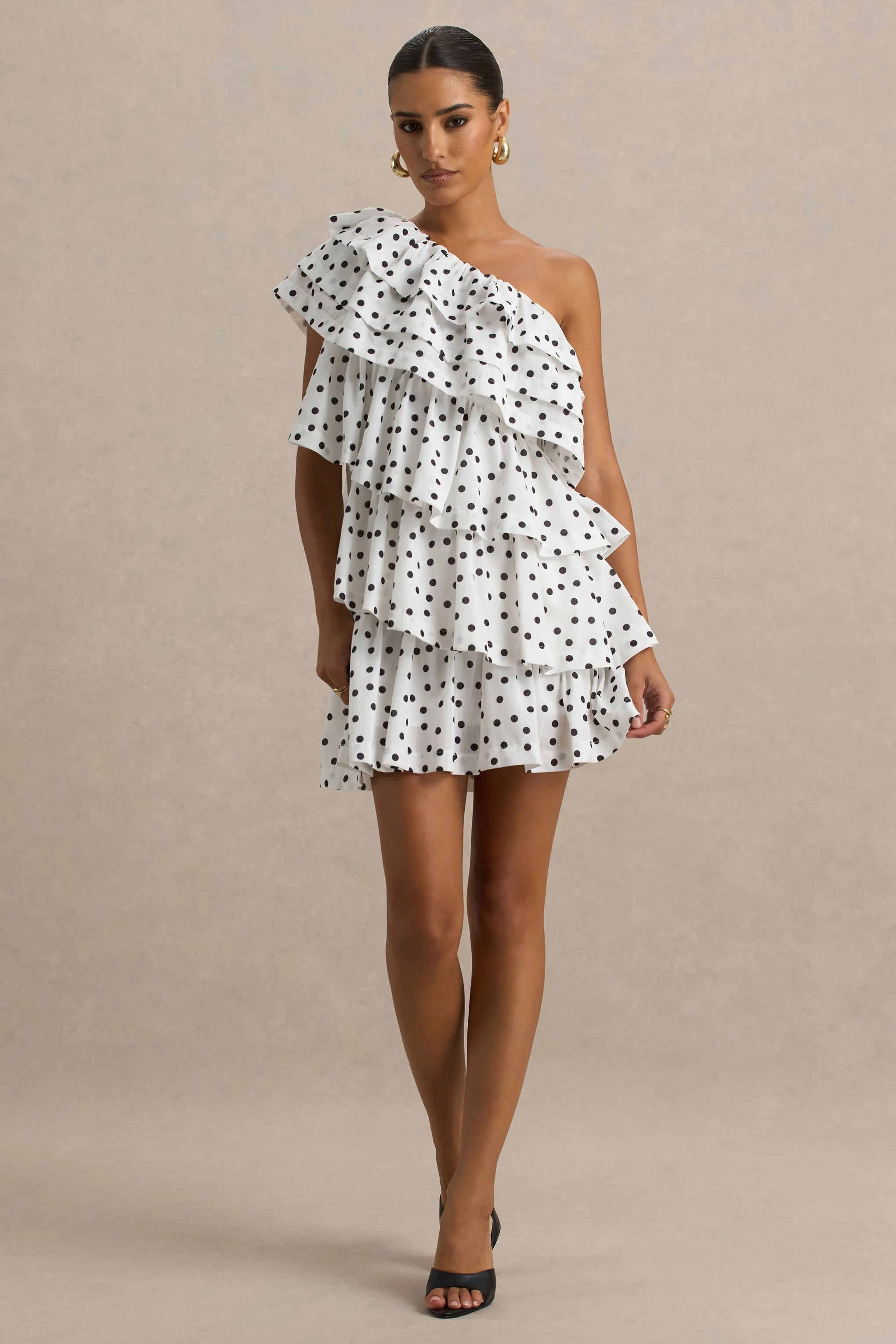 Flirty and playful, Orla is the perfection piece to elevate your spring summer wardrobe. This striking mini dress is cut in a timeless white polka dot print of our premium linen, perfect for sun soaked days. The asymmetric neckline brings a modern edge that gorgeously contrast with the feminine and romantic ruffled detailing. From ladies brunches to rooftop cocktails, in Orla you will exude elegance from every angle. Pair with sleek sunglasses and a glamorous up-do to tie everything together.