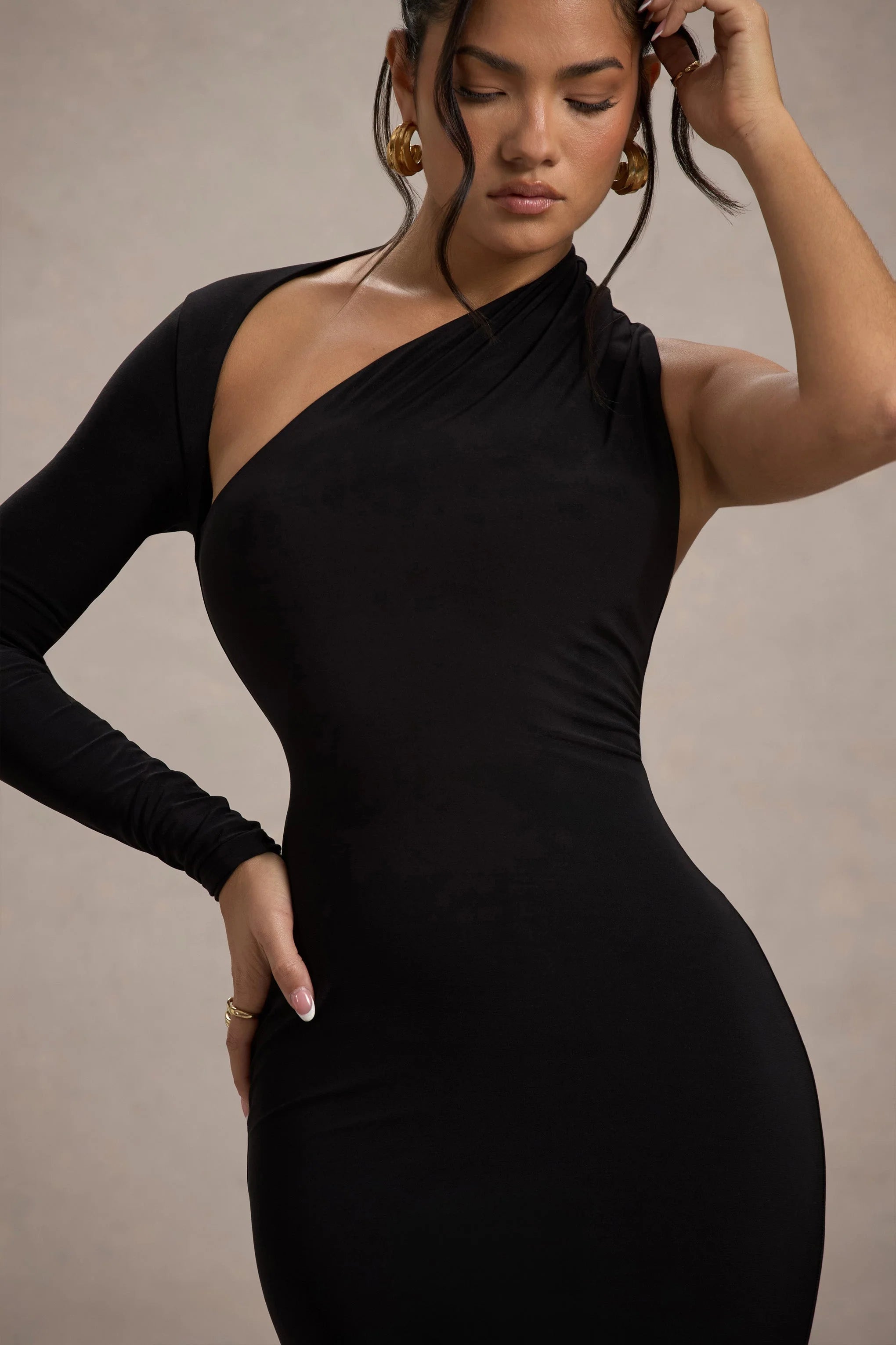 Defined by artful asymmetry, Orsa is an alluring addition to any wardrobe. Carefully crafted in a premium stretch jersey, this black maxi dress offers both a comfortable and form-flattering fit. Show off its contemporary one-shoulder neckline by styling yours with a tousled bun and subtle accesories.
