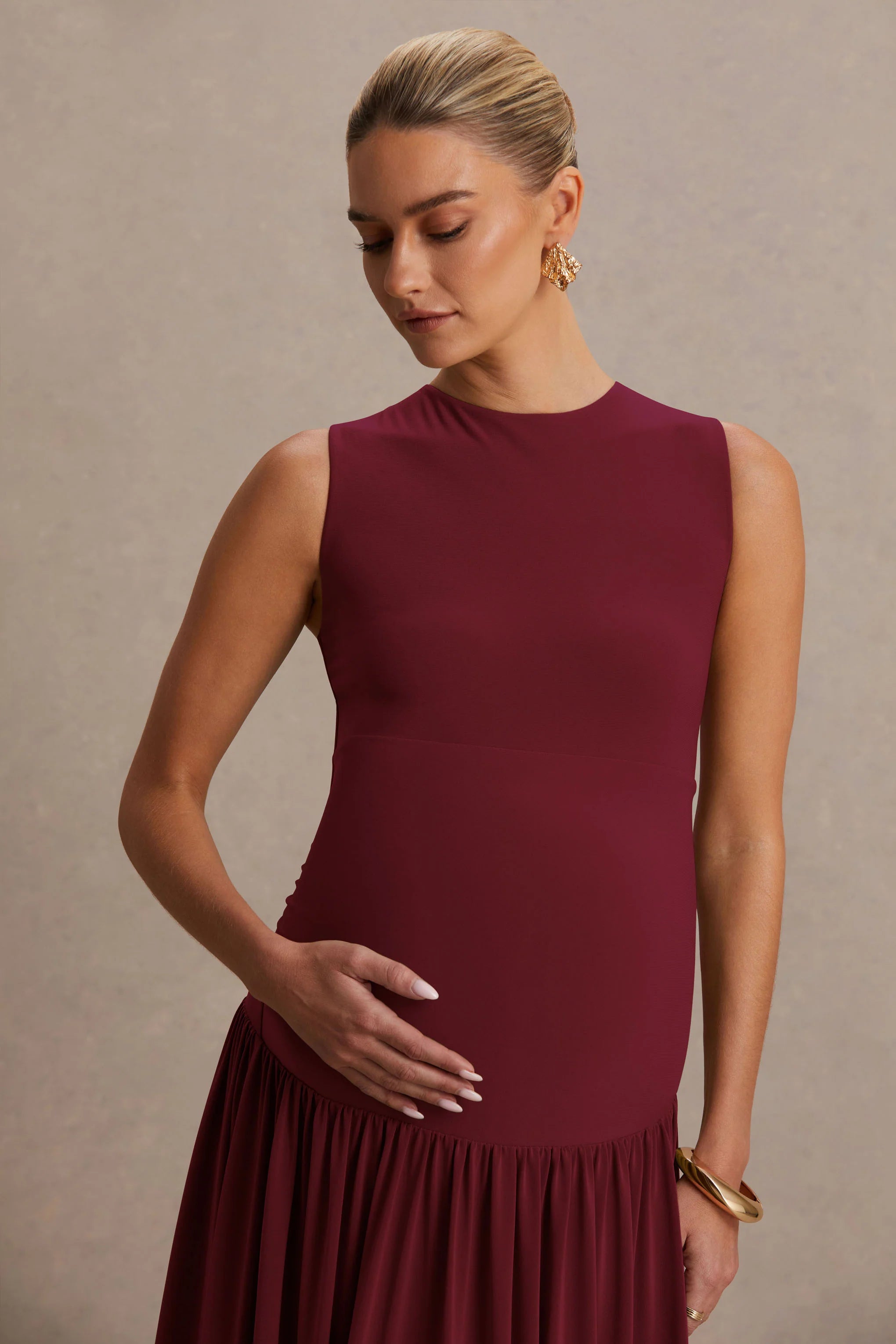Introducing Outline, the ultimate maxi dress designed to flatter you're growing bump in style. Crafted from our premium stretch jersey in a dreamy burgundy hue, this elegant piece offers both comfort and elegance. Featuring a chic crew neckline and expertly placed ruching that flatters your figure. Outline is the perfect piece for baby showers, special occasions and any other dressed up moment where you want to feel effortlessly glamorous. Style with gold jewellery and radiate confidence.