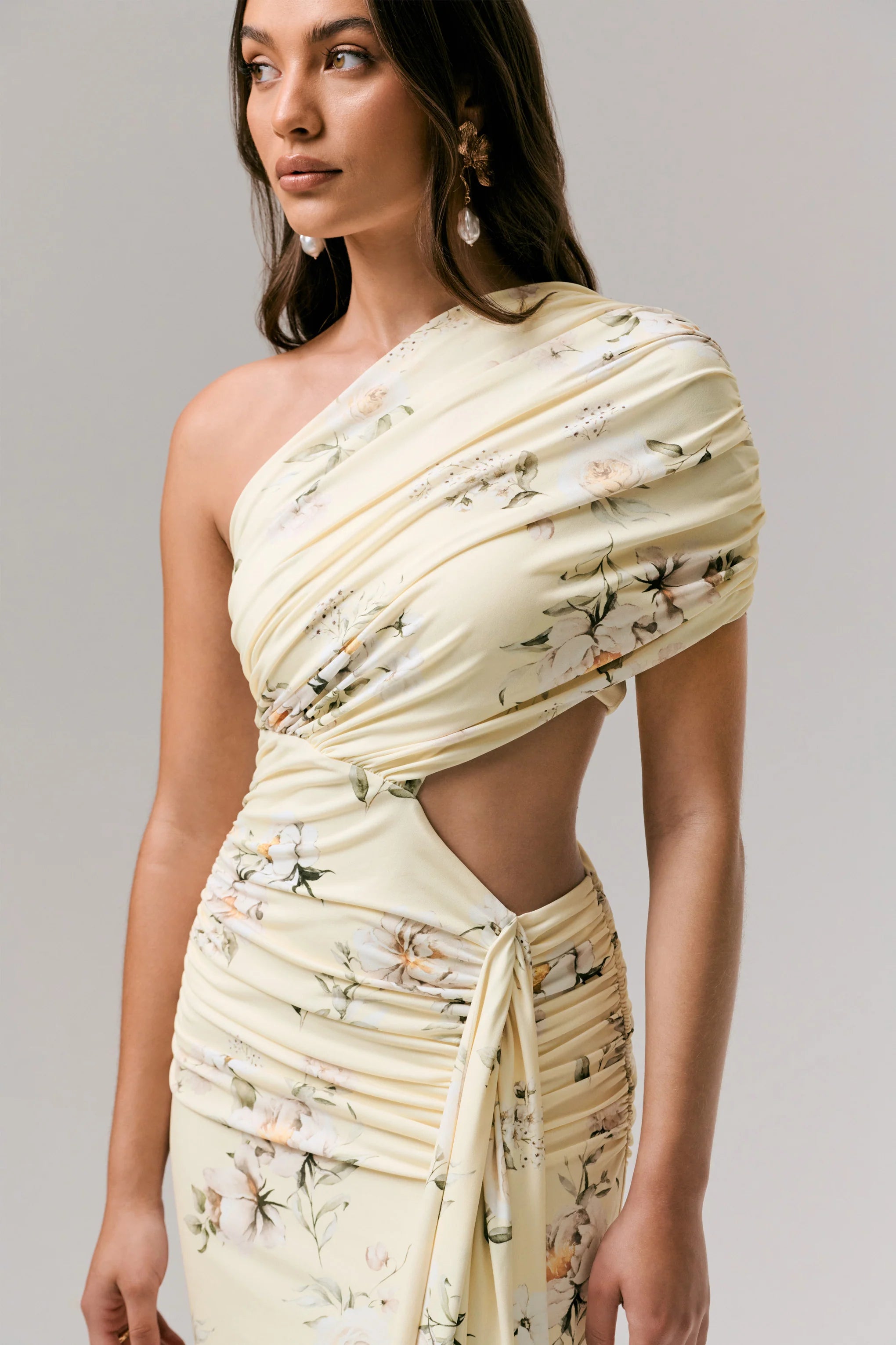Make a bold statement at your next special occasion in Overload. Crafted in a delicate lemon print of our premium stretch jersey, this maxi dress seamlessly skims over your curves creating a dreamy silhouette. Designed with striking modern features, including an asymmetric neckline and a body cut-out detail, Overload is made to turn heads. The gathered detailing and wrap skirt flatter you're figure effortlessly, ensuring that you exude fierce confidence into any room. Finished with a delicate drape that meets a sultry high-leg split adding the perfect amount of allure, this gown is made for stand-out moments. Pair with strappy heels and dainty jewellery to complete the look.