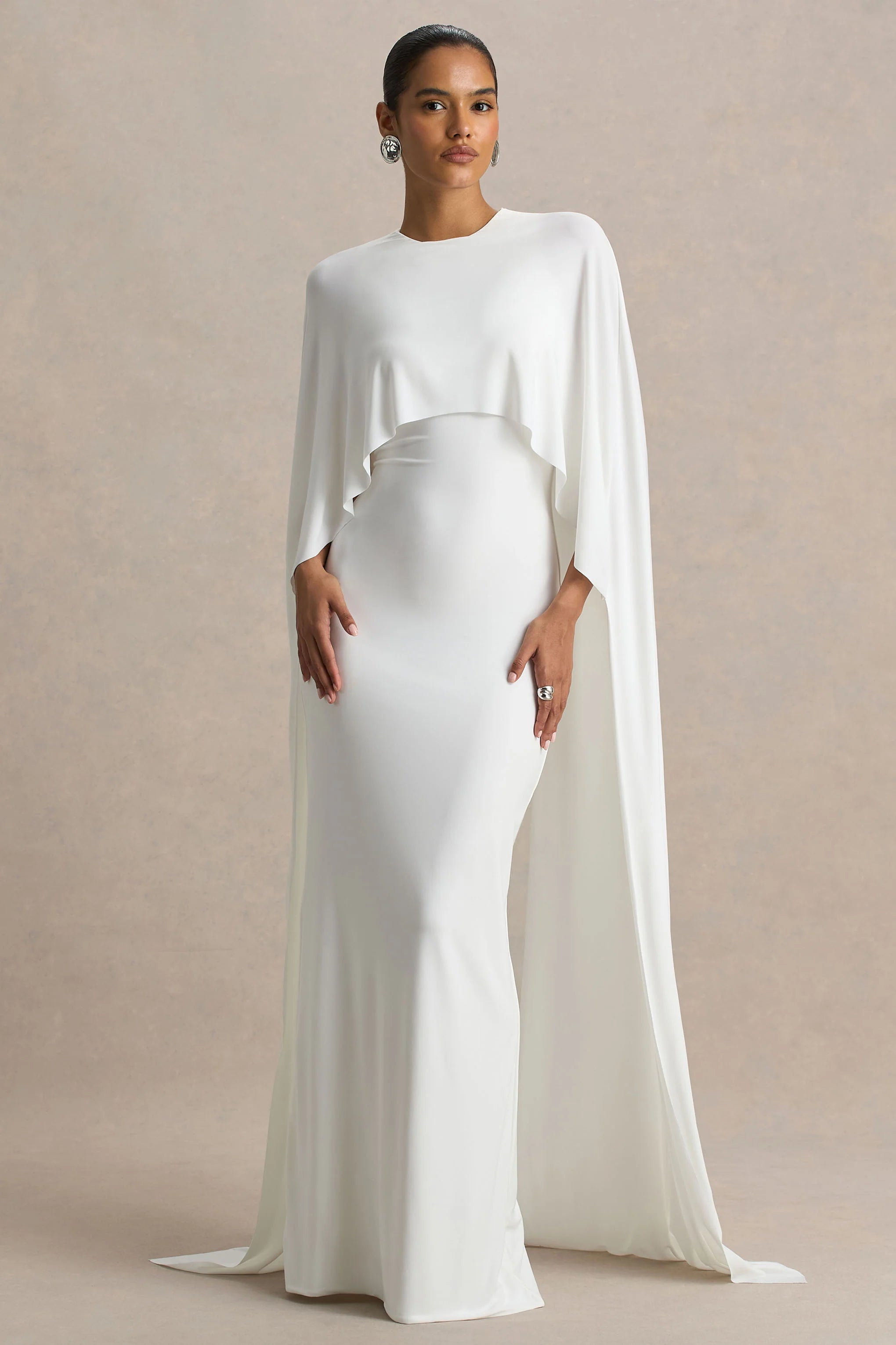 Captivate from all angles in Padma, our opulent white maxi dress. Crafted in a premium stretch jersey, Padma sculpts your frame with a flattering bodycon fit. Defined by floor length cape sleeves that command attention, try styling yours with a sleek bun and our Sanya earrings for the ultimate occasion look.