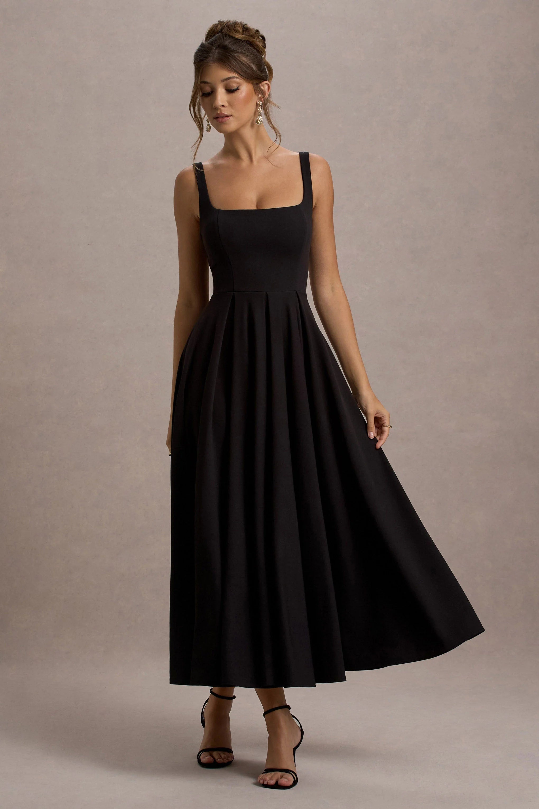 Exude a feminine charm in Parina, our classic black midi dress. Designed in a premium scuba crepe, this playful piece features a supportive square neckline and flowing pleated skirt. A stand-out staple, Parina is proof that keeping it simple doesn’t mean playing it safe.