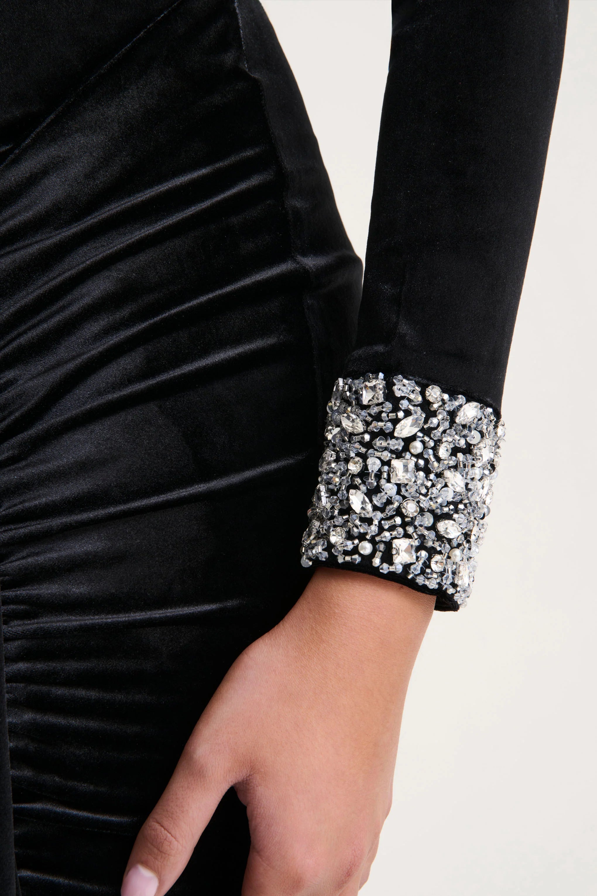 Say hello to Perrin, a statement maxi designed for the most glamorous of evenings. Crafted from our premium black velvet, this sleek silhouette features a sophisticated crew neckline and dazzling embellished detailing at the cuffs for a touch of opulence. A daring front-high split adds movement and allure, creating the perfect balance of elegance and drama. Perrin is made for moments that call for true after-dark sophistication.