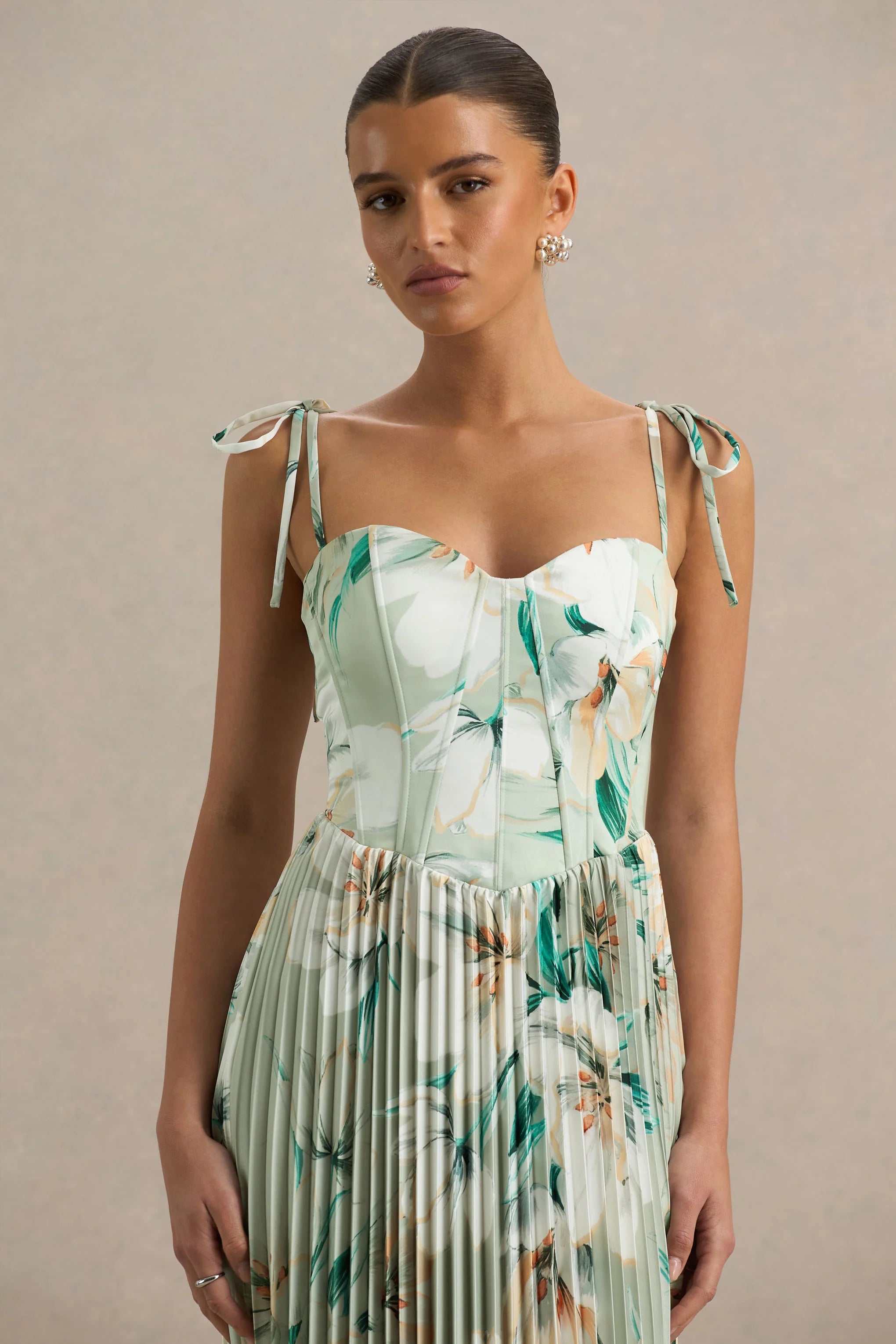 Exude timeless elegance and soft femininity, for all dressed-up moments this season, in Peyton. Crafted in a delicate green floral print of our premium stretch satin, this midi dress captures a look of classic glamour with a modern twist. Cut with a chic sweetheart neckline and self-tie straps, this midi gorgeously displays your decolletage. The internal bust cups and a boned bodice, paired with the self-tie back detail, create a sleek and snatched silhouette ensuring you are flattered from all angles. Finished with a pleated a-line skirt that elevates this dress by adding effortless movement with every step. From garden parties to wedding receptions, in Peyton, you won't be forgotten.