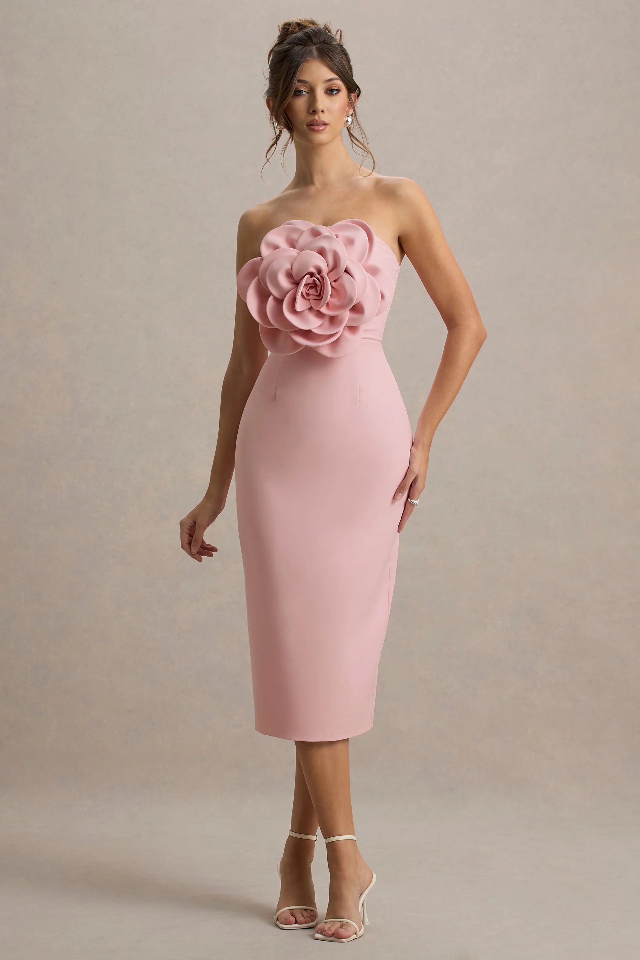 Step into the season looking completely graceful in our latest midi, Phina. Curated from our premium stretch crepe in a gorgeous pink hue, this piece is made for stand out moments. Elevated with statement, oversized corsage details that are beautifully complimented by the soft, feminine bandeau neckline. This midi offers a refined look that is perfect for any dressed up occasion, from race days to glamorous dinners, in Phina you will wow any room.