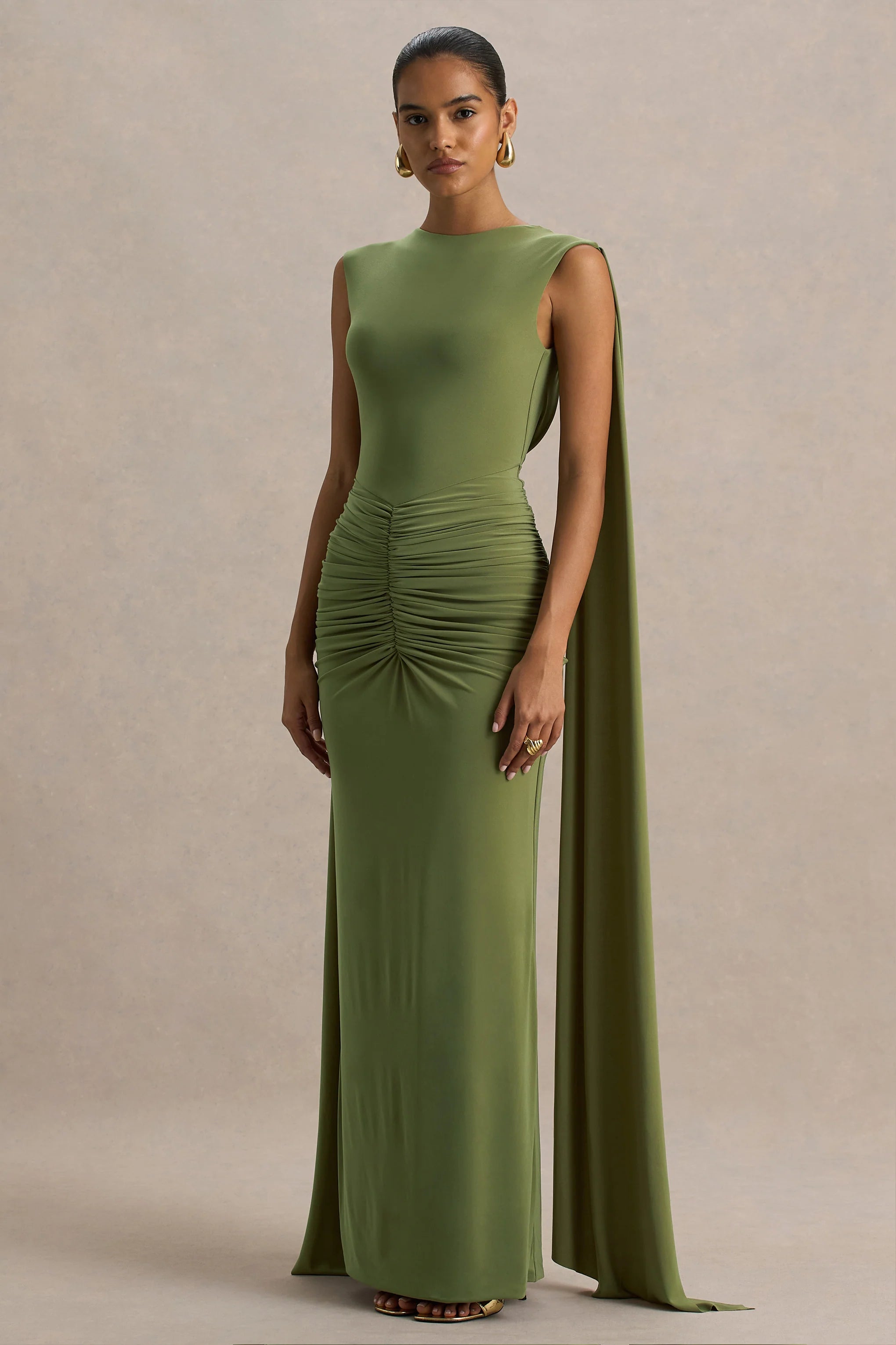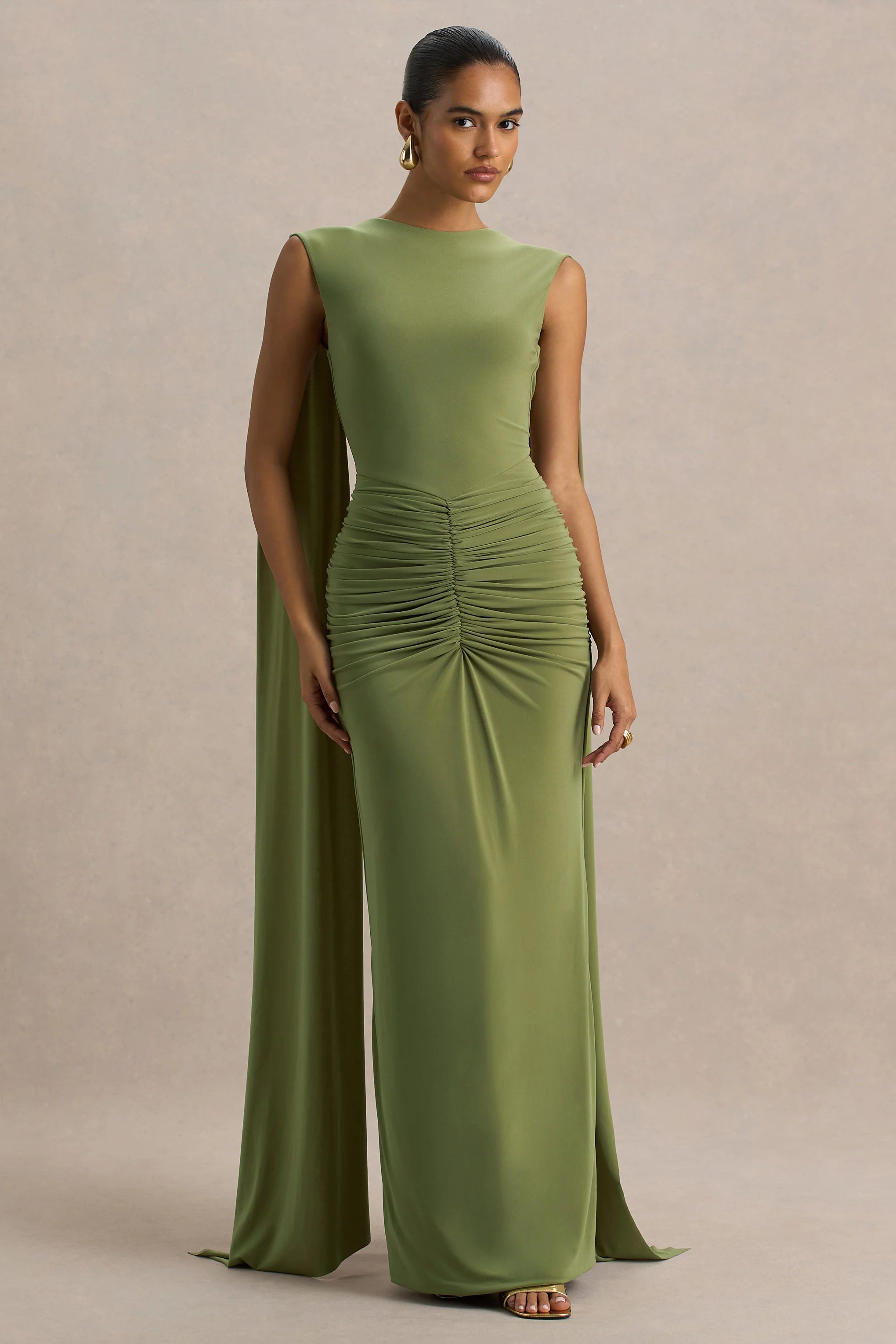 Make your entrance unforgettable in Premiere, a gown designed to captivate from every angle. Crafted in our premium olive stretch jersey, this maxi dress hugs and contours in all the right places, effortlessly sculpting your silhouette. Featuring a sophisticated boat neckline and dramatic cape sleeves, Premiere brings red carpet energy to any occasion. The open back adds a touch of allure, while ruched detailing flatters your figure with luxe texture. This floor-sweeping gown is your go-to for black-tie moments, galas, and all things glam.