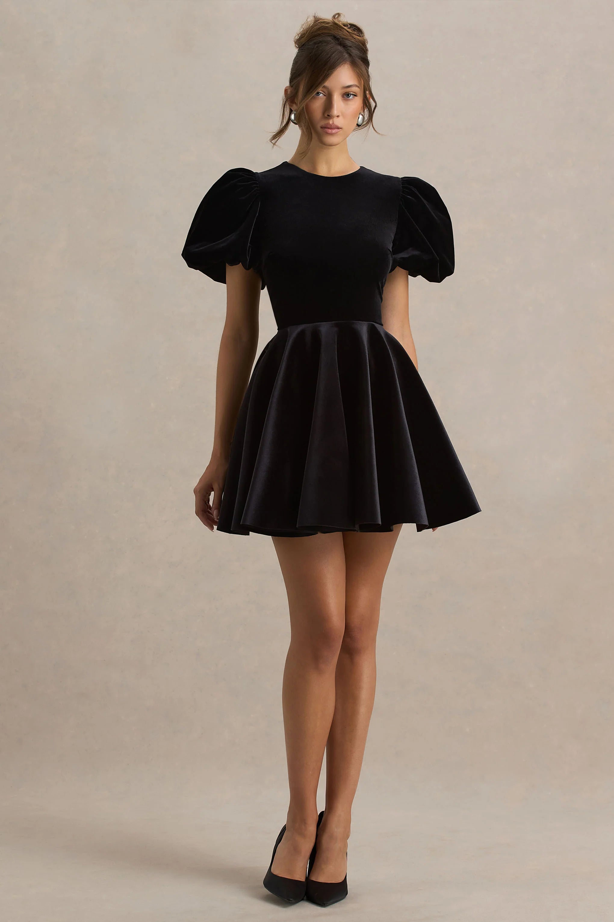 Say hello to Priya, the playful yet polished piece your wardrobe’s been craving. Crafted from our premium black velvet, this mini is the perfect balance of charm and sophistication. Featuring a classic crew neckline and voluminous puff sleeves, Priya brings a romantic edge to every occasion. The flirty skater skirt adds movement and flair, while the keyhole back detail adds a subtle touch of allure. A showstopper made to steal the spotlight, style with sleek heels and a glam up-do.