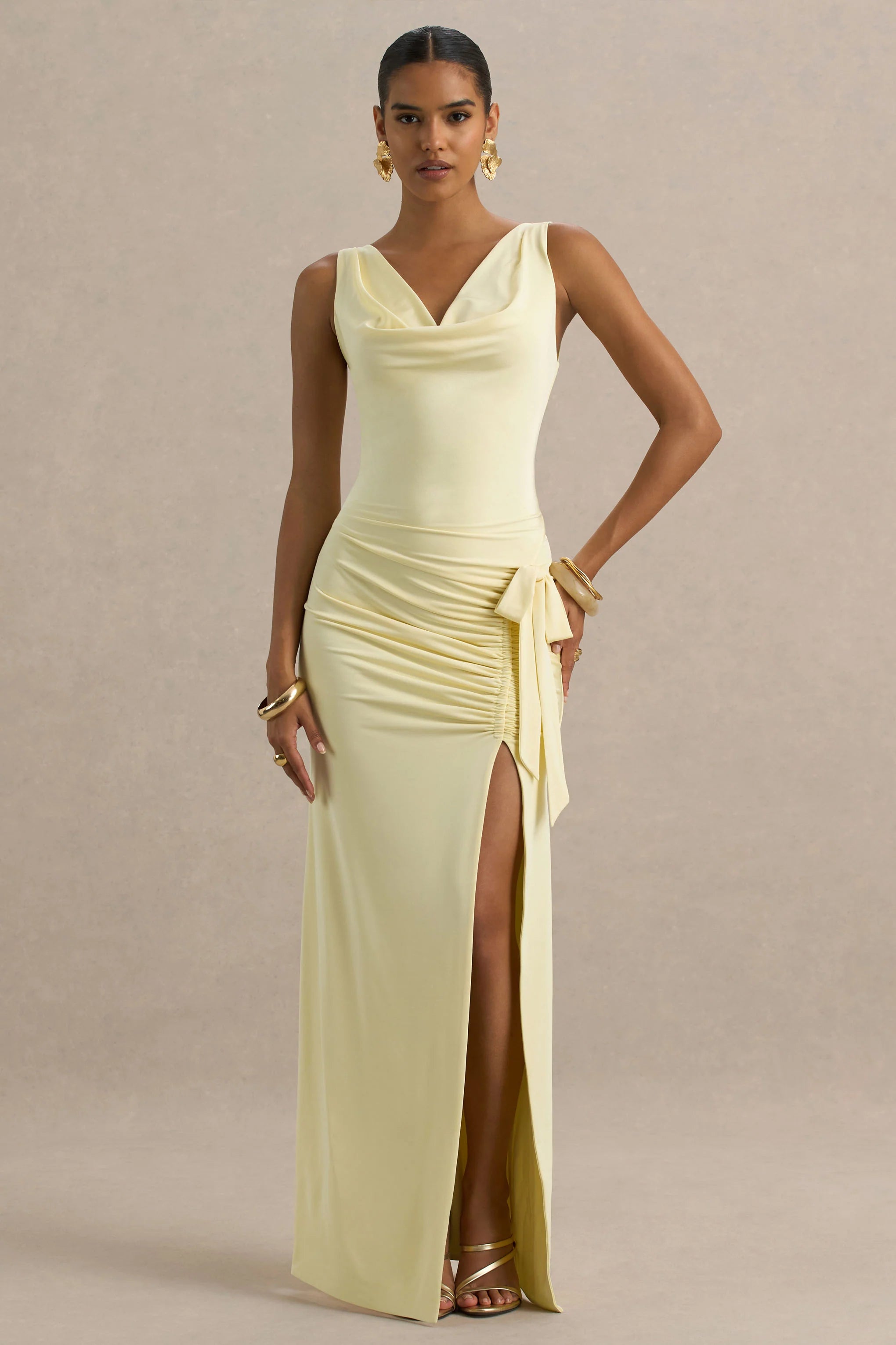 Embrace soft femininity and elegance in Pure Affection, a captivating piece for your next dressed up moment. Crafted from a rich pale lemon shade of our premium disco jersey, this maxi dress effortlessly skims your curves for an all around, flattering finish. Designed with a romantic cowl neckline that delicately displays your decolletage, and figure enhancing ruched detailing with a functional tie to sculpt your silhouette. The front high split brings the right amount of allure and drama to this chic gown. From weddings to elegant date nights, in Pure Affection you will exude confidence.