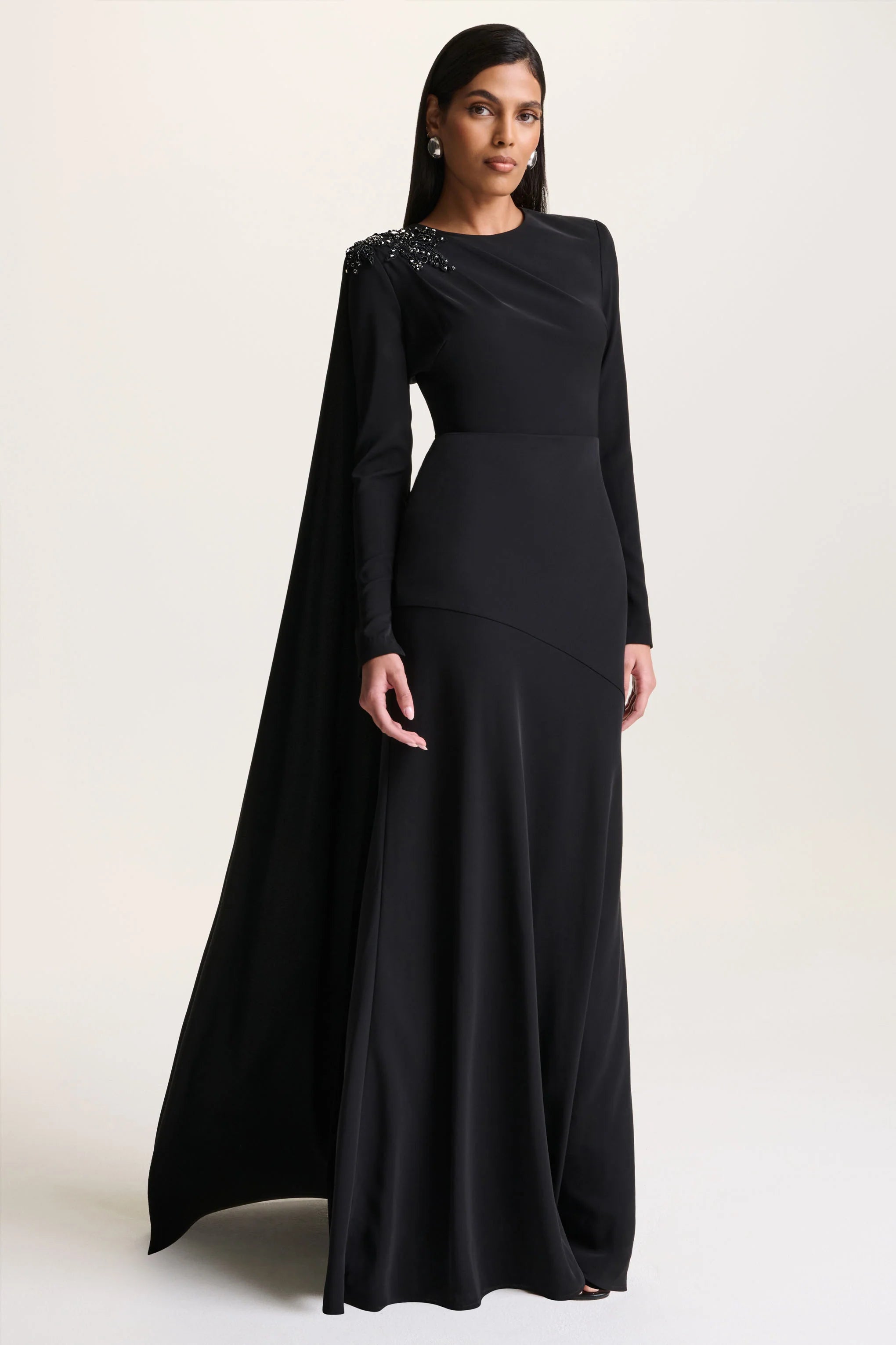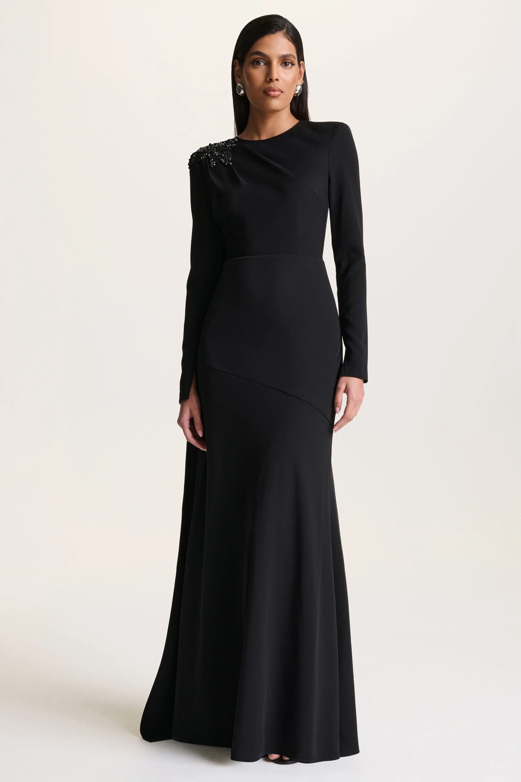 Turn heads effortlessly in Reese, a masterclass in modern elegance. Crafted from our premium crepe, this sleek black silhouette boasts a high neckline and delicate hand-embellished shoulder detailing, adding just the right hint of sparkle. The back-sash detail drapes beautifully, creating a flattering, feminine shape, while the ruffled hemline introduces playful movement to every step. Designed for statement-making moments, Reese your go-to for nights that demand glamour.