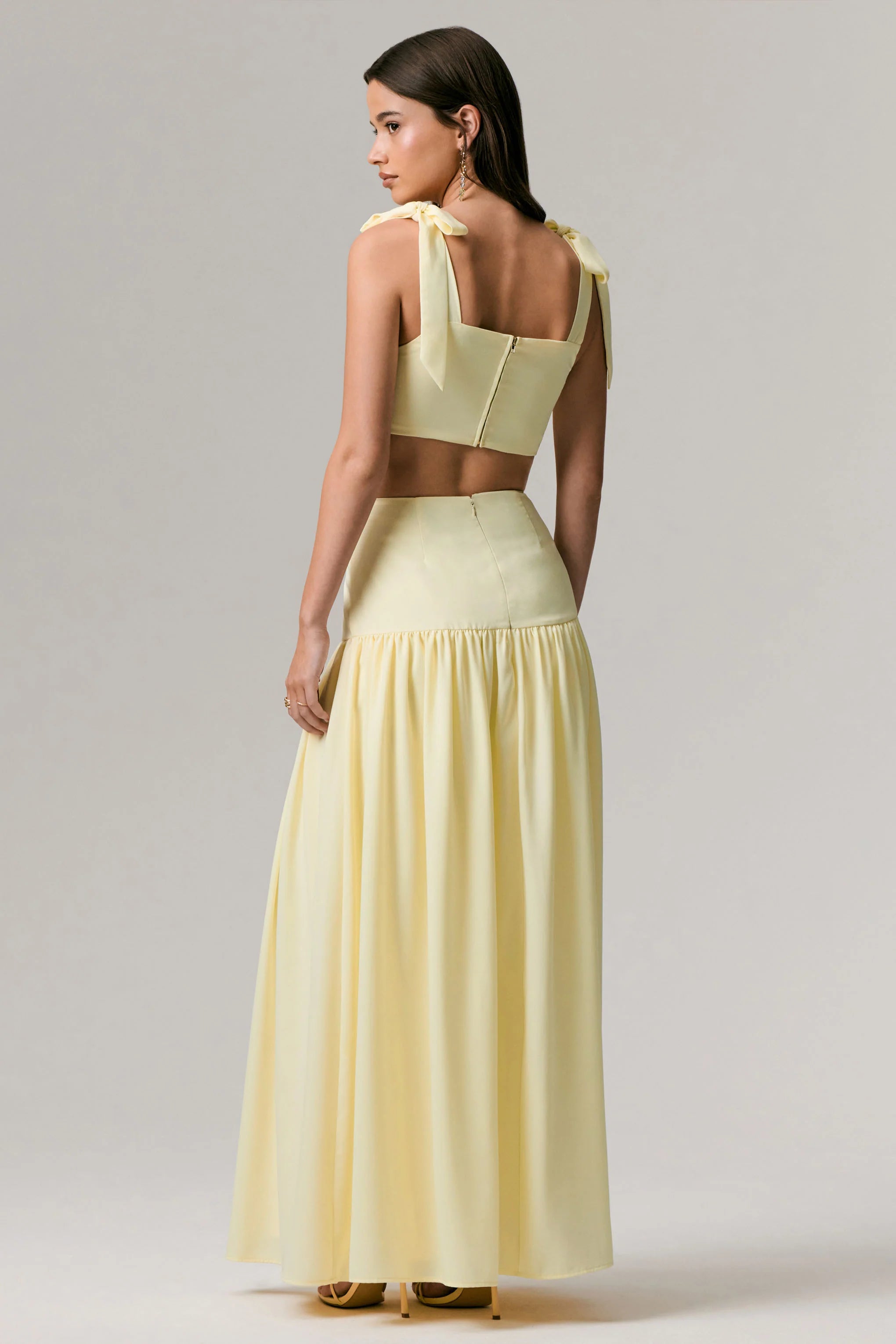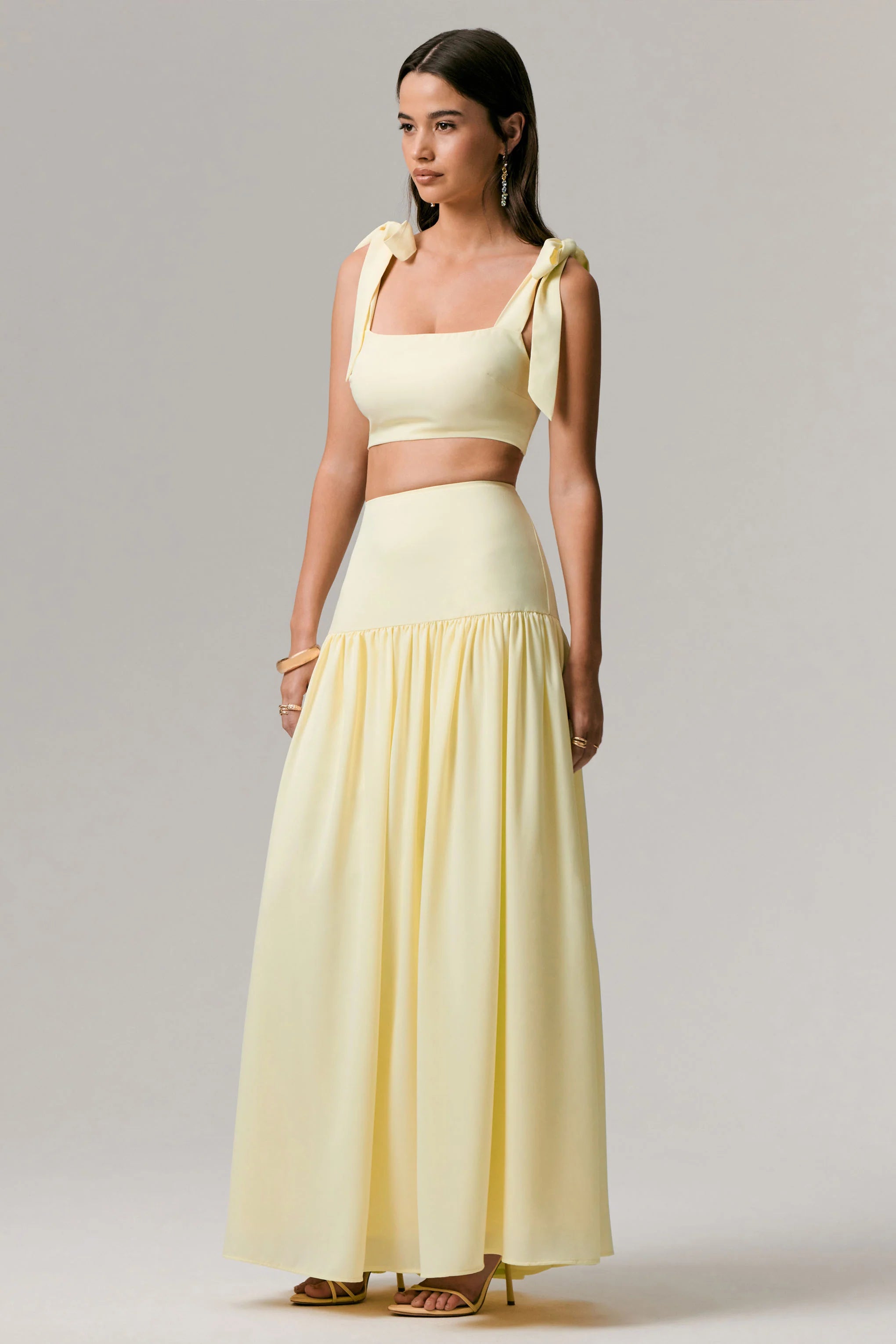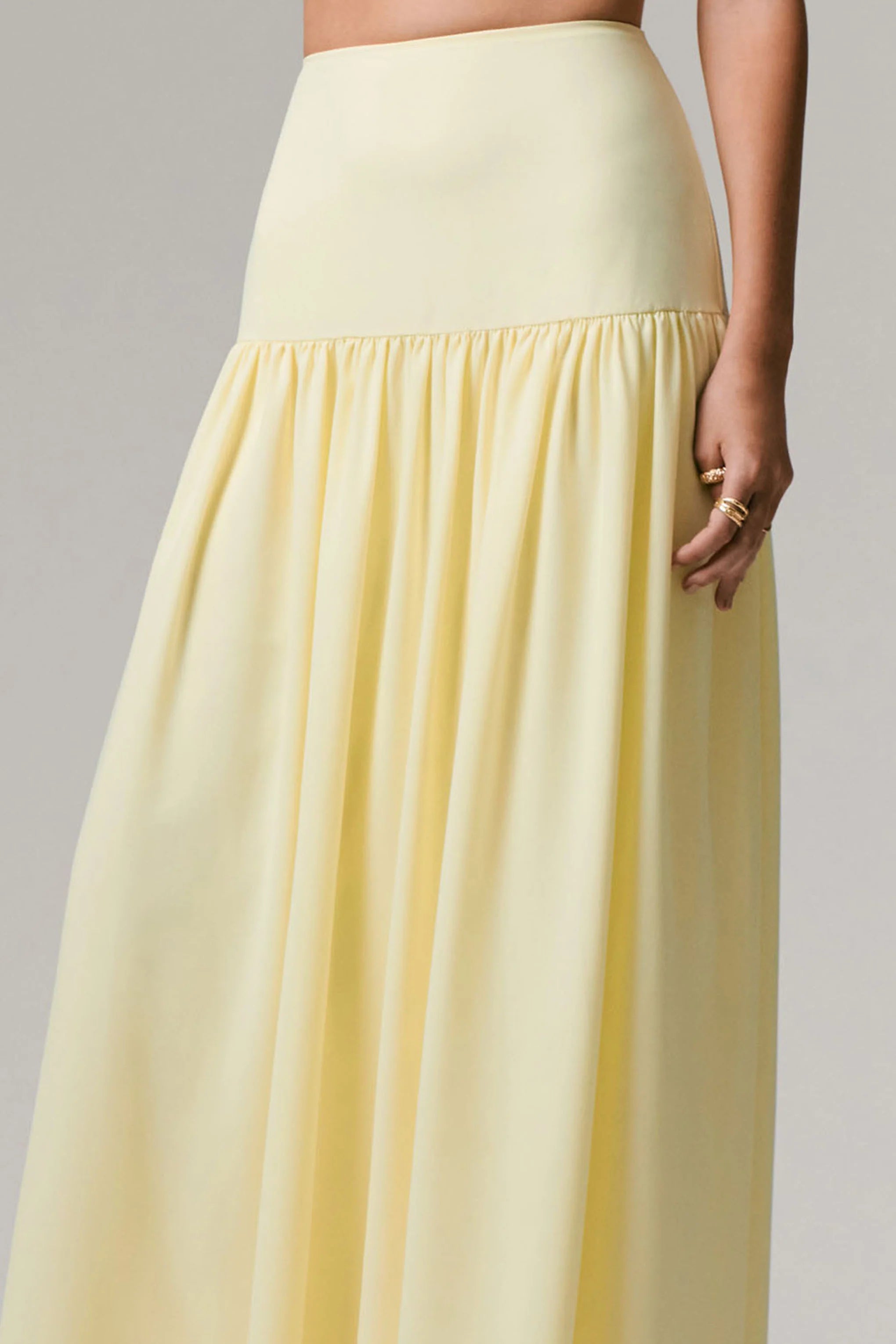 Graceful and refined, Reminiscent is designed to make a subtle yet striking statement. Crafted from our premium crepe in a soft lemon hue, this maxi skirt is the epitome of effortless sophistication. The drop waist silhouette elongates the figure, while the flowing full-length skirt adds a touch of timeless elegance. Whether you're dressing for a special event or a stylish evening out, make a memorable entrance in Reminiscent by pairing with our Elodie top.