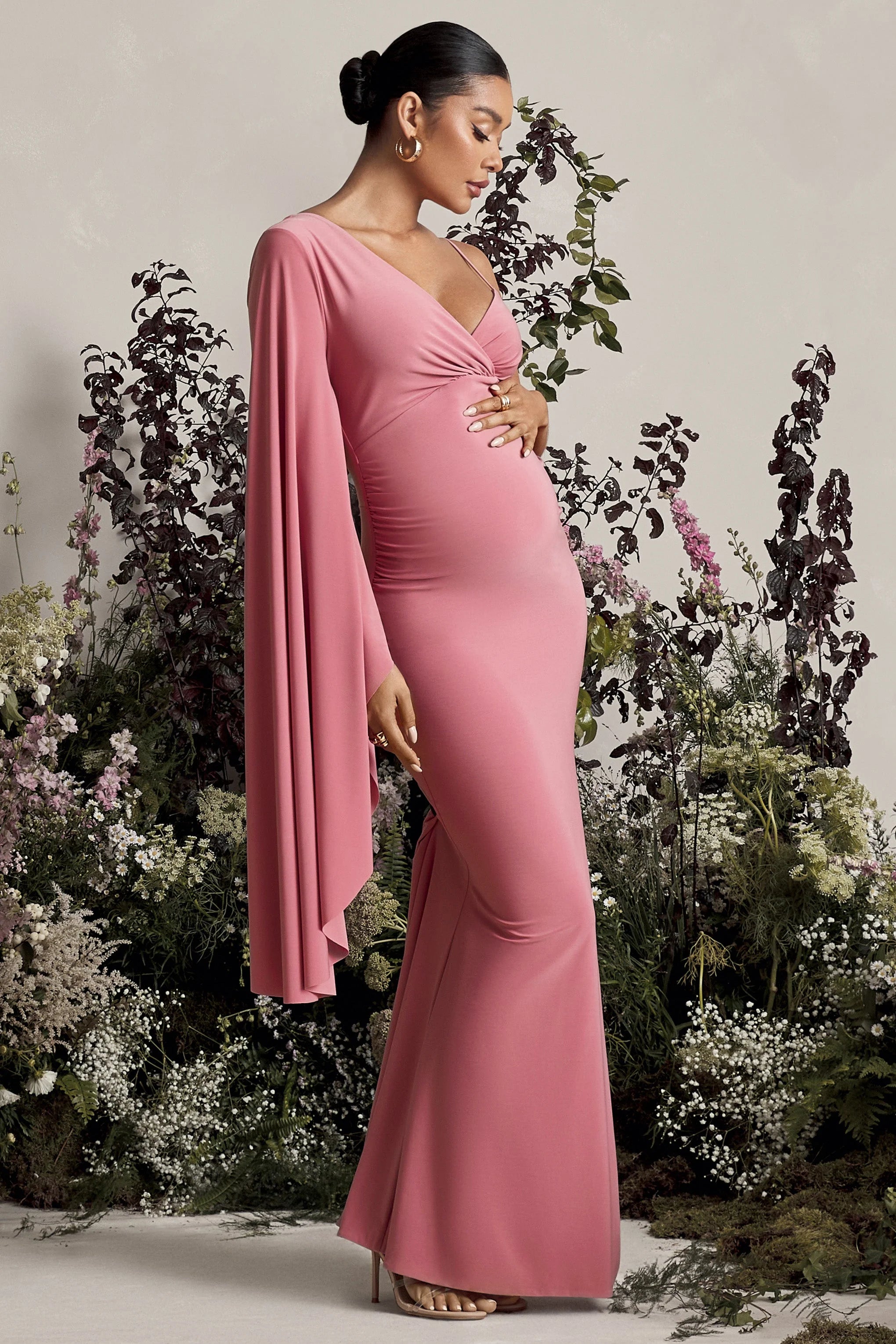 Perfect for baby showers, weddings and everything in between, Rhea is a formal wardrobe must-have. Crafted in a soft pink shade of our signature stretch jersey, this v-neck maternity maxi dress was designed with your comfort at the forefront. Characterised by a singular cape sleeve, Rhea concludes with subtle bump ruching and a high-leg split.