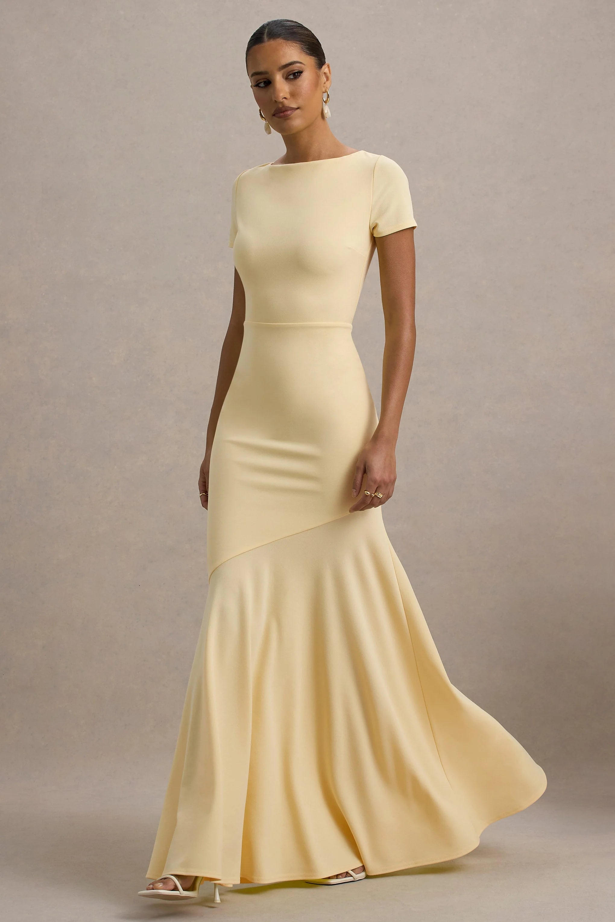 Showcasing a minimalistic silhouette, Rian is a core wardrobe essential. Designed in a lavish pale lemon shade of our stretch scuba crepe, this floor-sweeper is defined by a timeless boat neckline, keyhole cut-out and short, cap sleeves. Perfect for that upcoming summer wedding, style yours with some bouncy curls and golden accents like Maple.