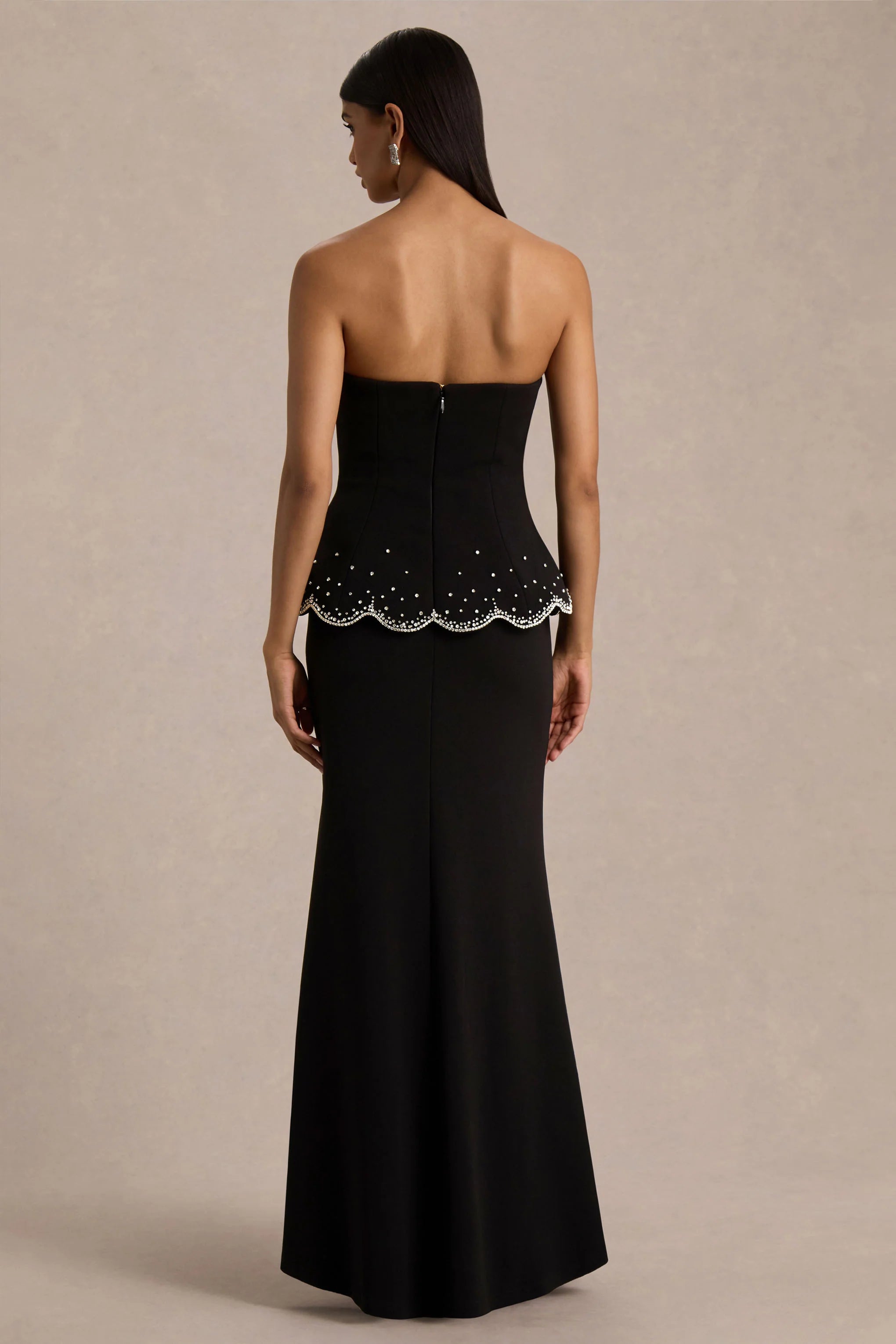 Command attention in Robin a glamorous maxi that embodies timeless sophistication. Crafted from our premium crepe in classic black, it sculpts the figure to perfection for a beautifully flattering silhouette. The bandeau neckline highlights the shoulders with elegant simplicity, while the hand-embellished and scalloped detailing add a touch of refined sparkle. Finished with a dramatic fishtail skirt, Robin delivers red-carpet glamour with every step, a true showstopper for your next special occasion.
