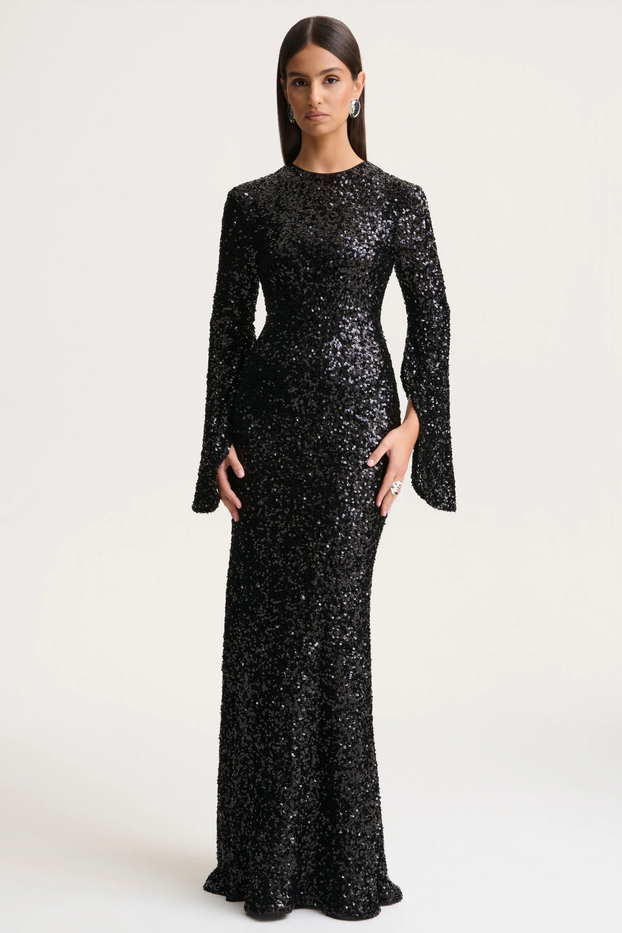 Romea is elevated evening-wear at its finest. Crafted from our premium black sequin, this maxi dress glitters with every step while sculpting a flattering silhouette. The round neckline keeps it refined, while flowing cape sleeves add movement and high-impact glamour. Floor-sweeping in length, Romea is the ultimate showstopper for nights that call for unforgettable sparkle.