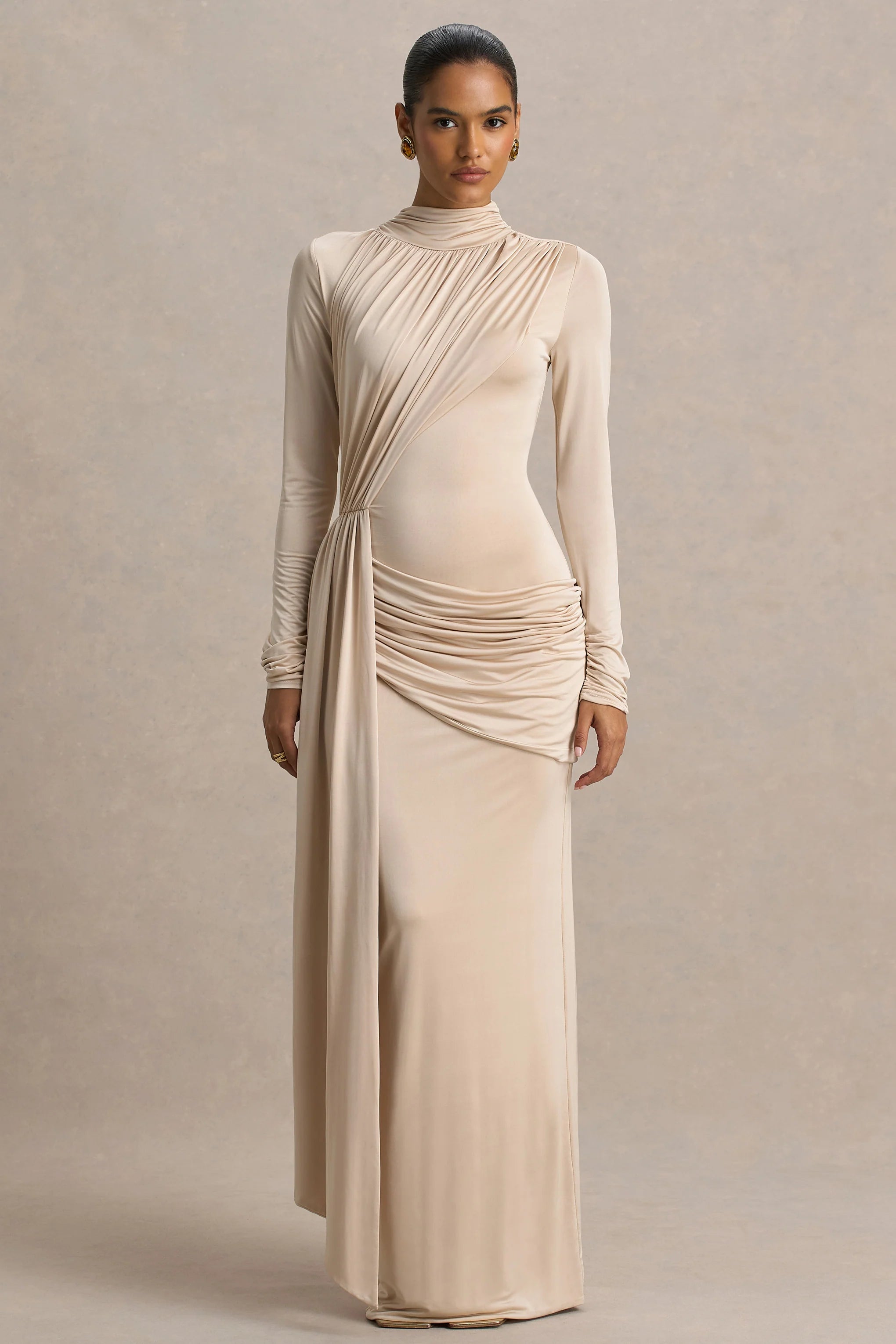Dazzle at after dark moments in Romi, a radiant design destined to turn heads. Crafted from our shimmering premium disco jersey in an opulent champagne hue, this floor-sweeping maxi dress is the definition of refined glamour. Designed with a high neckline and soft, gathered sleeves, Romi captivates from every angle. The fluid draped sash cascades elegantly from the neck and another sash cinches at the waist, adding movement and drama with every step. Expertly placed ruching ensures a sculpted, flattering fit, making this a silhouette that hugs your curves in all the right places.