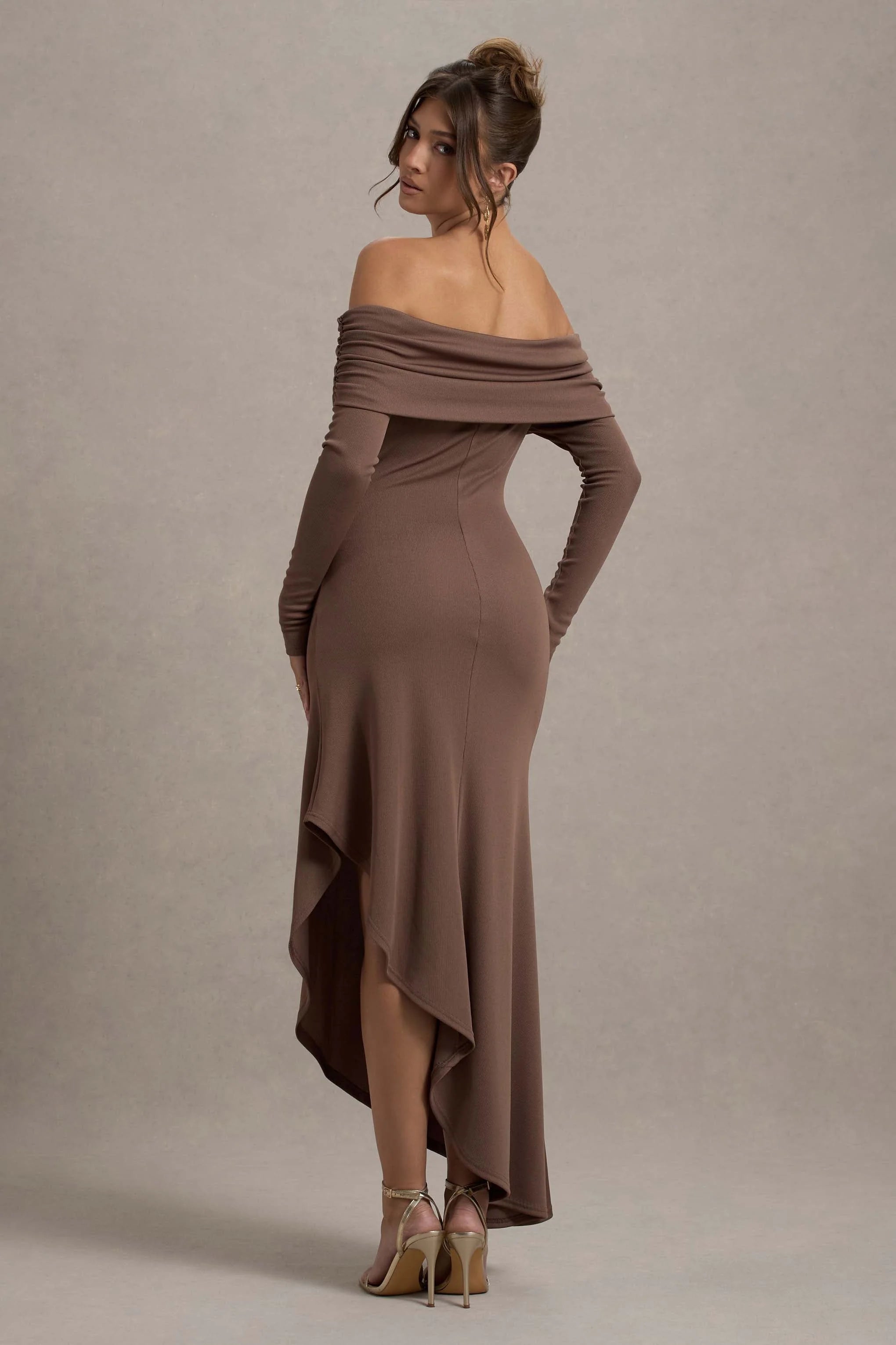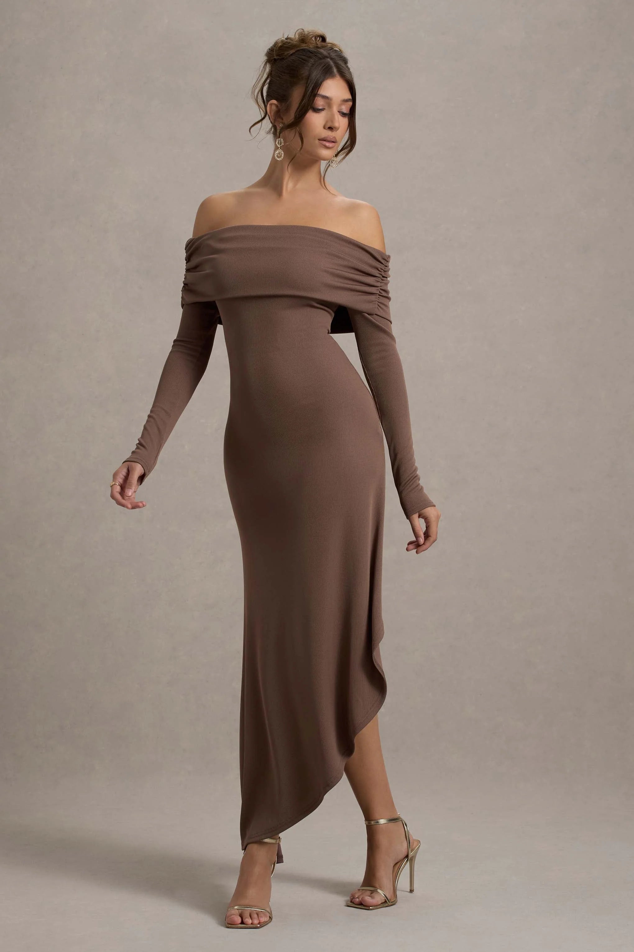 A simple staple, our Romina dress was made to see you through every occasion. This black maxi has been expertly designed in a premium ribbed knit for a sculpting comfortable fit. Romina has an elegant bardot neckline with long feminine sleeves and a romantic asymmetric skirt for added flare. Dress this style from day to night by styling with our Hear Me court heels and some gold accents.