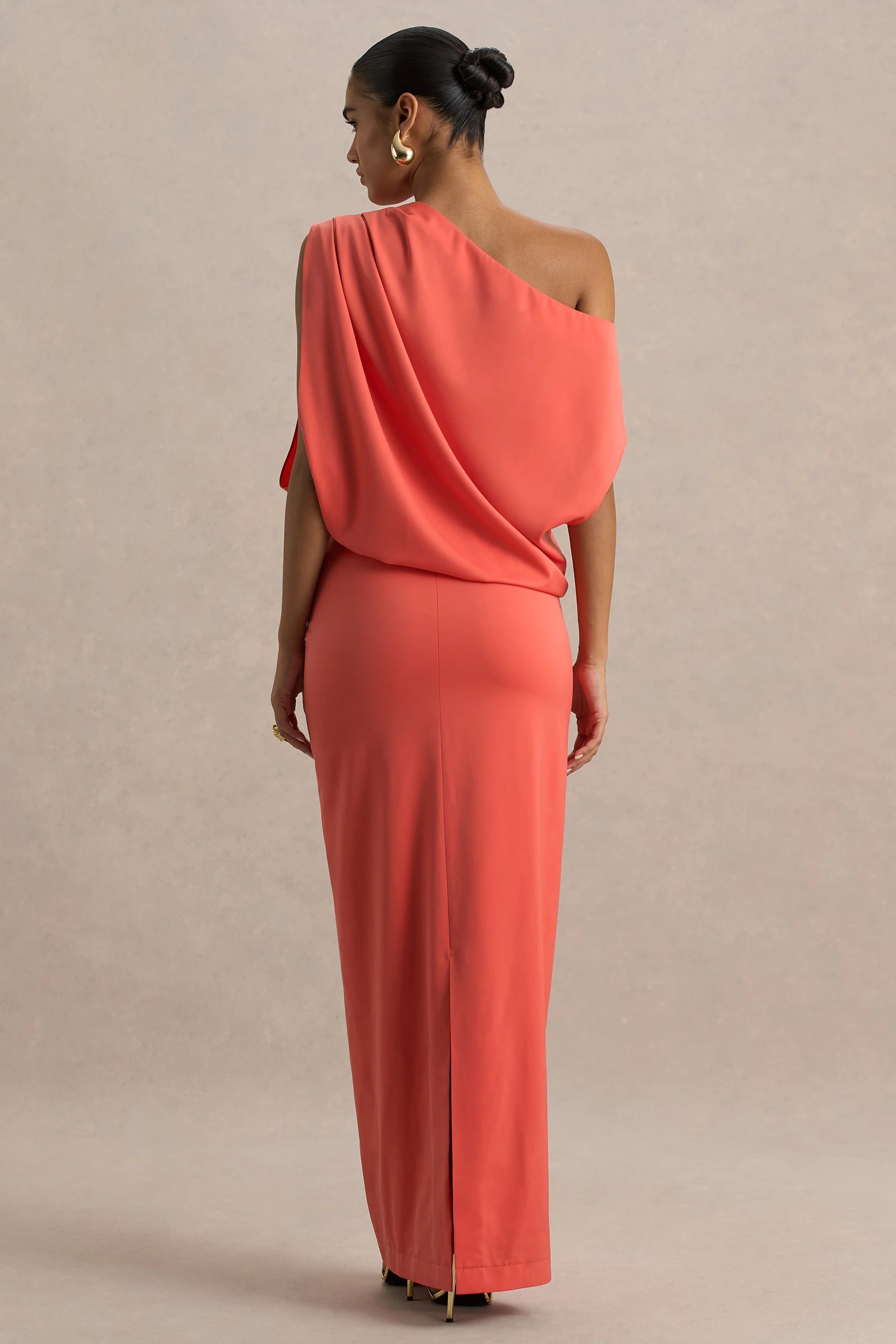 Designed to flow with grace and captivate with ease, Ronnie brings a fresh take on refined occasion wear. Cut from our premium satin in a bold coral hue, this elegant maxi dress is made for unforgettable moments. The asymmetric neckline and blouson overlay bodice offer soft structure and delicate movement, while the maxi-length skirt is finished with a centre-back split for a touch of allure. Perfect for weddings, evening events or destination celebrations paired with sleek heels.