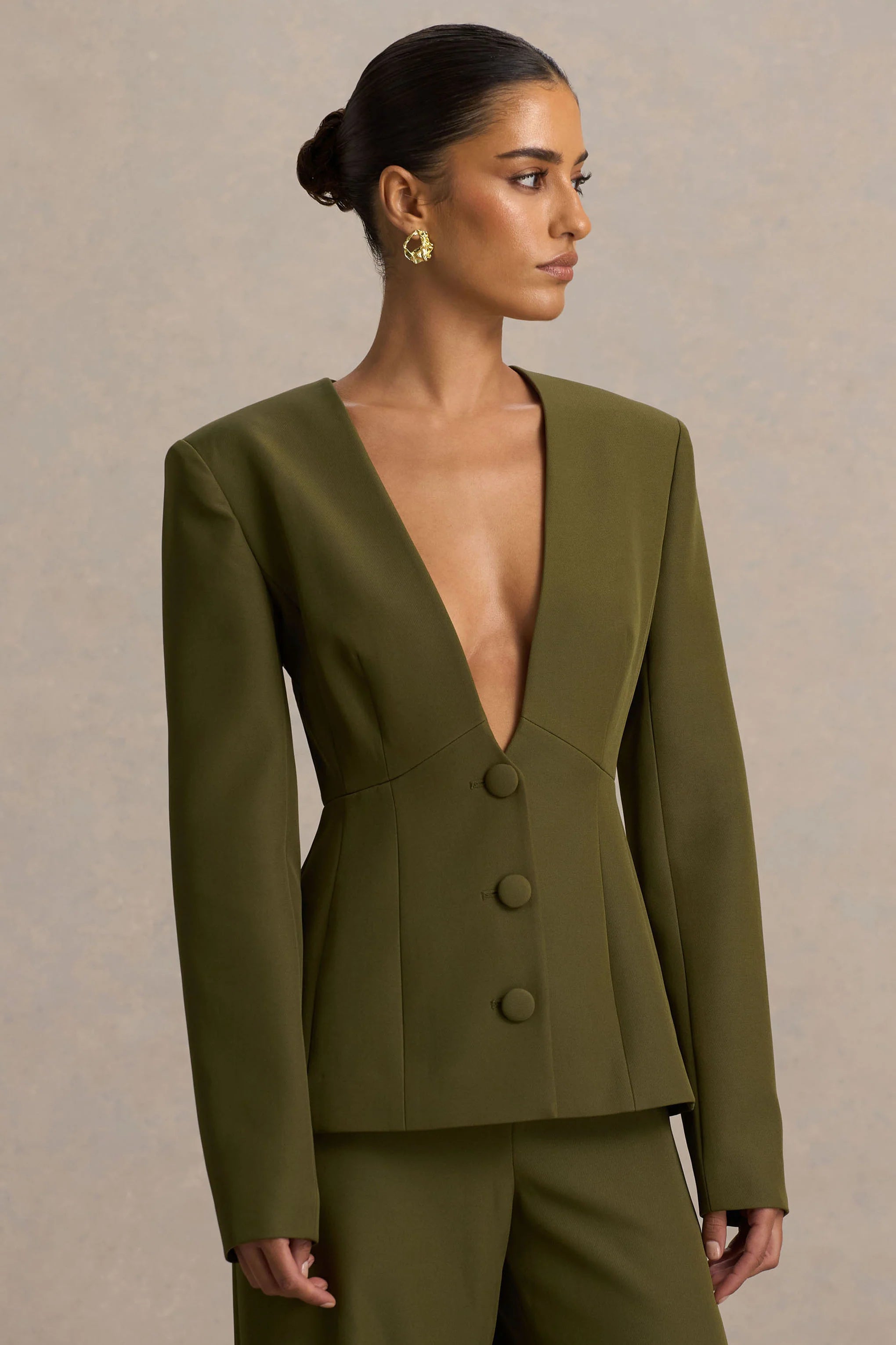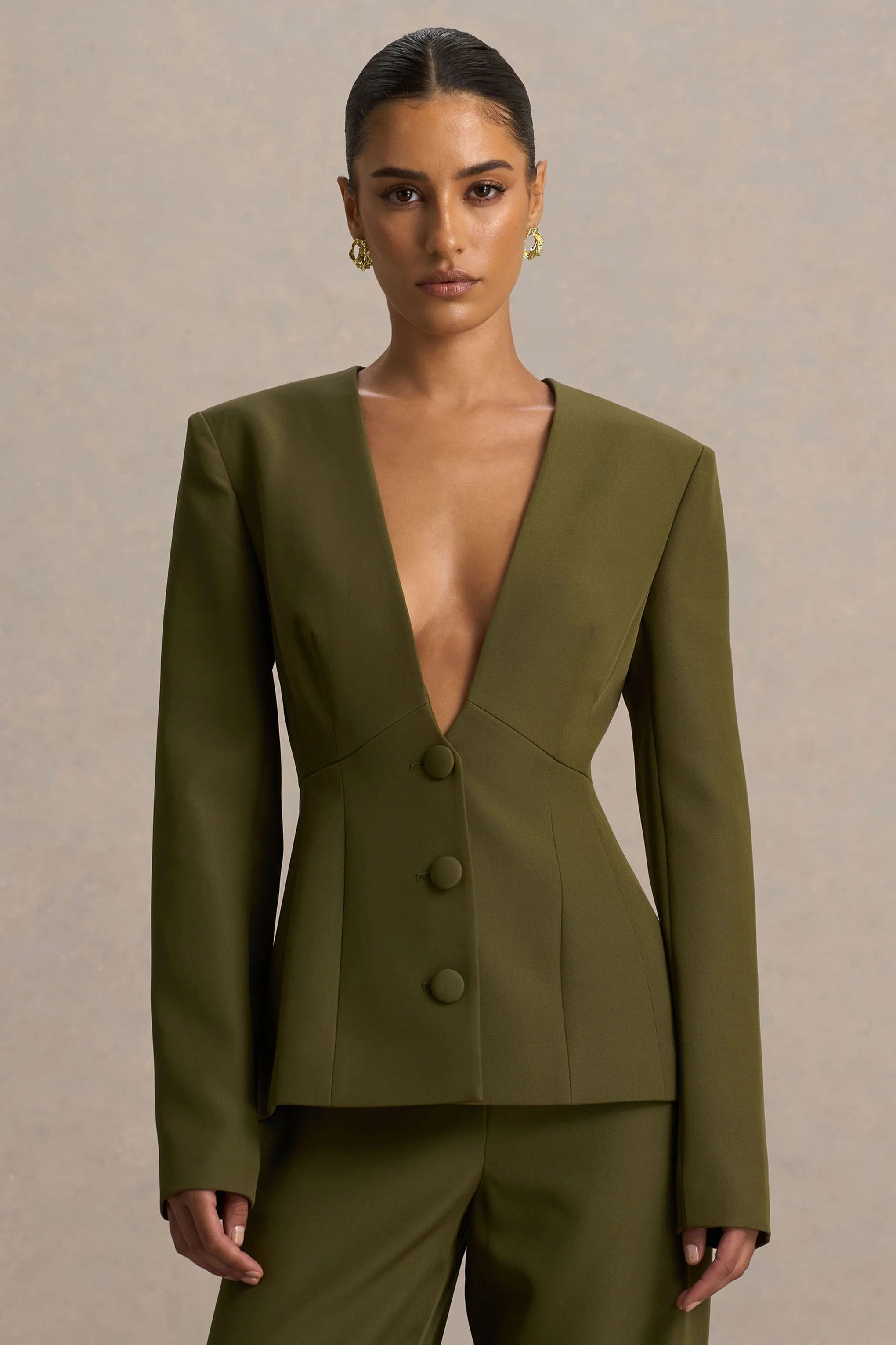 Introducing Rosalina, a power-piece that embodies sharp tailoring and feminine allure. Cut from our premium stretch crepe in a timeless olive hue, this statement blazer effortlessly balances structure with sophistication. Designed with a daring plunge neckline and elevated by strong shoulder pads, it commands attention with every wear. Finished with a sleek button closure for a polished touch, Rosalina is the ultimate layering piece for evenings that call for power and poise.