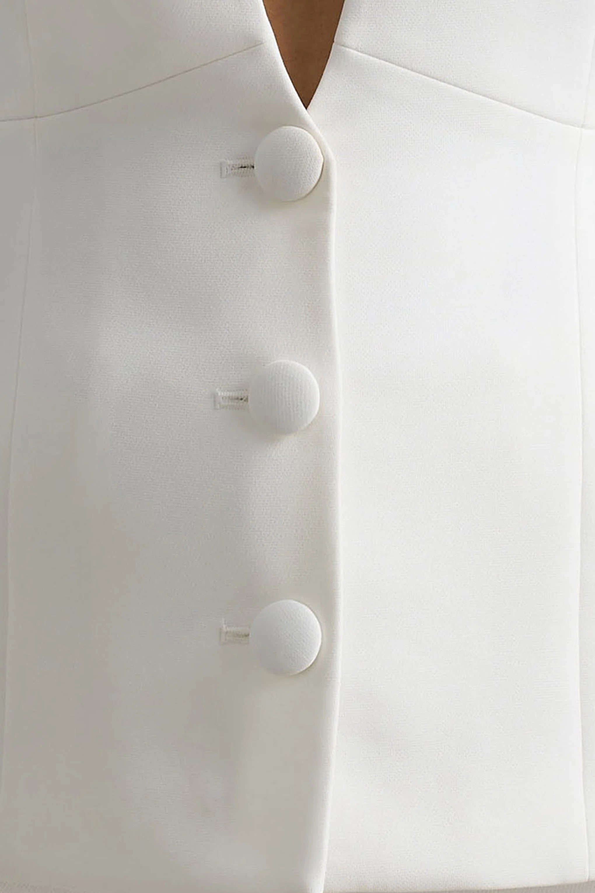 Introducing Rosalina, a power-piece that embodies sharp tailoring and feminine allure. Cut from our premium stretch crepe in a timeless white hue, this statement blazer effortlessly balances structure with sophistication. Designed with a daring plunge neckline and elevated by strong shoulder pads, it commands attention with every wear. Finished with a sleek button closure for a polished touch, Rosalina is the ultimate layering piece for evenings that call for power and poise.