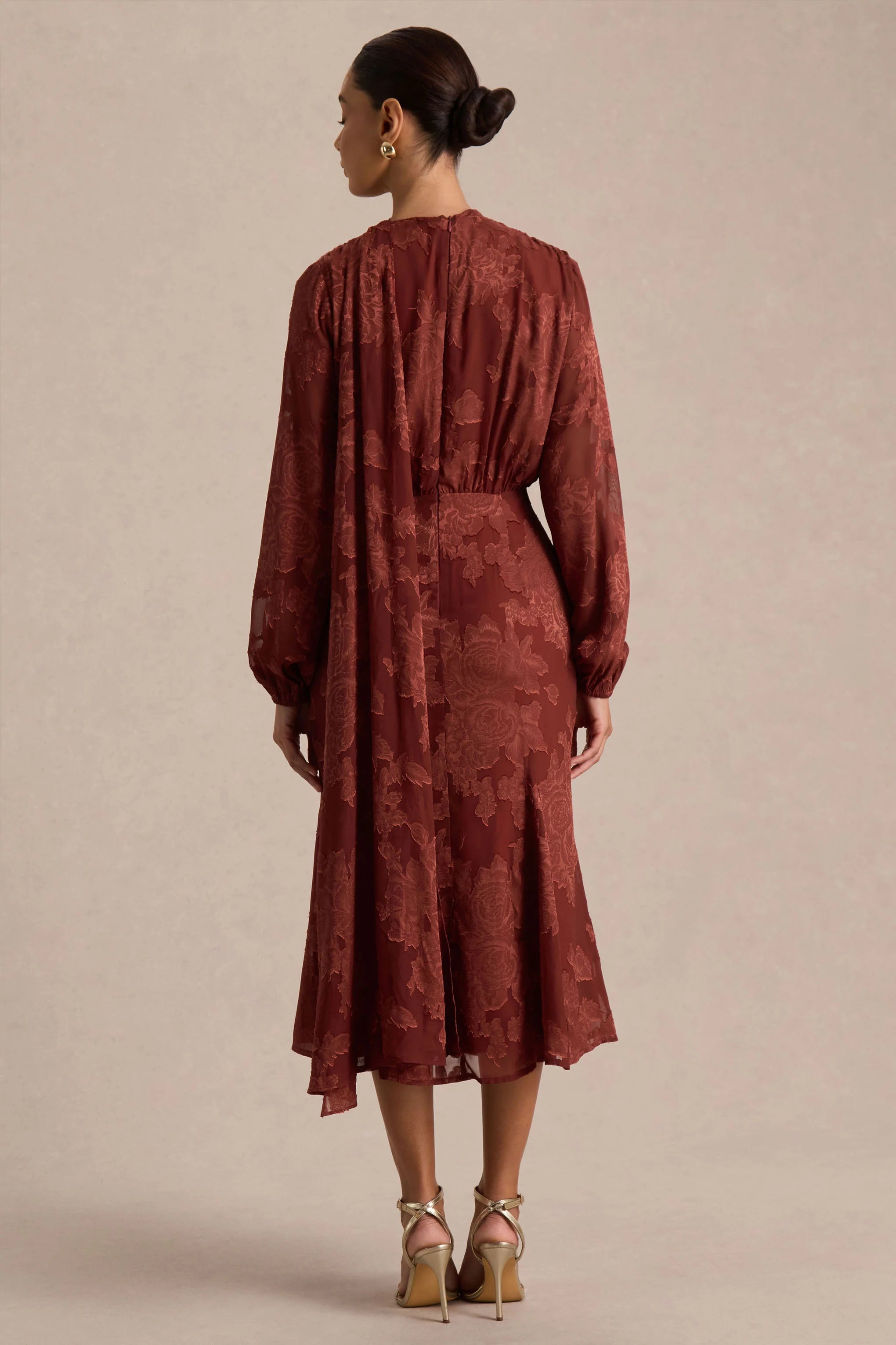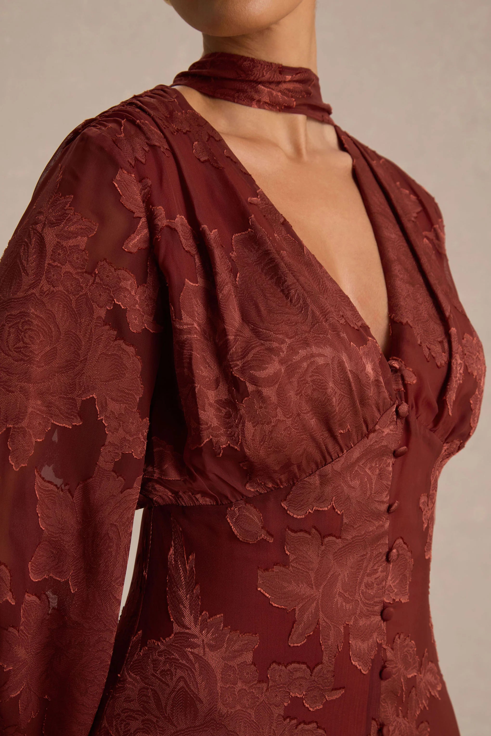 Say hello to Sabina, the midi dress that blends timeless glamour with modern allure. Crafted from our premium devore in a rich rust hue, its fluid midi silhouette flatters the figure with effortless sophistication. The plunge neckline and scarf detail add a touch of drama, while blouson sleeves and functional button detailing create soft movement. Finished with a front split for ease and elegance, Sabina is your go-to for refined evenings and standout occasions.