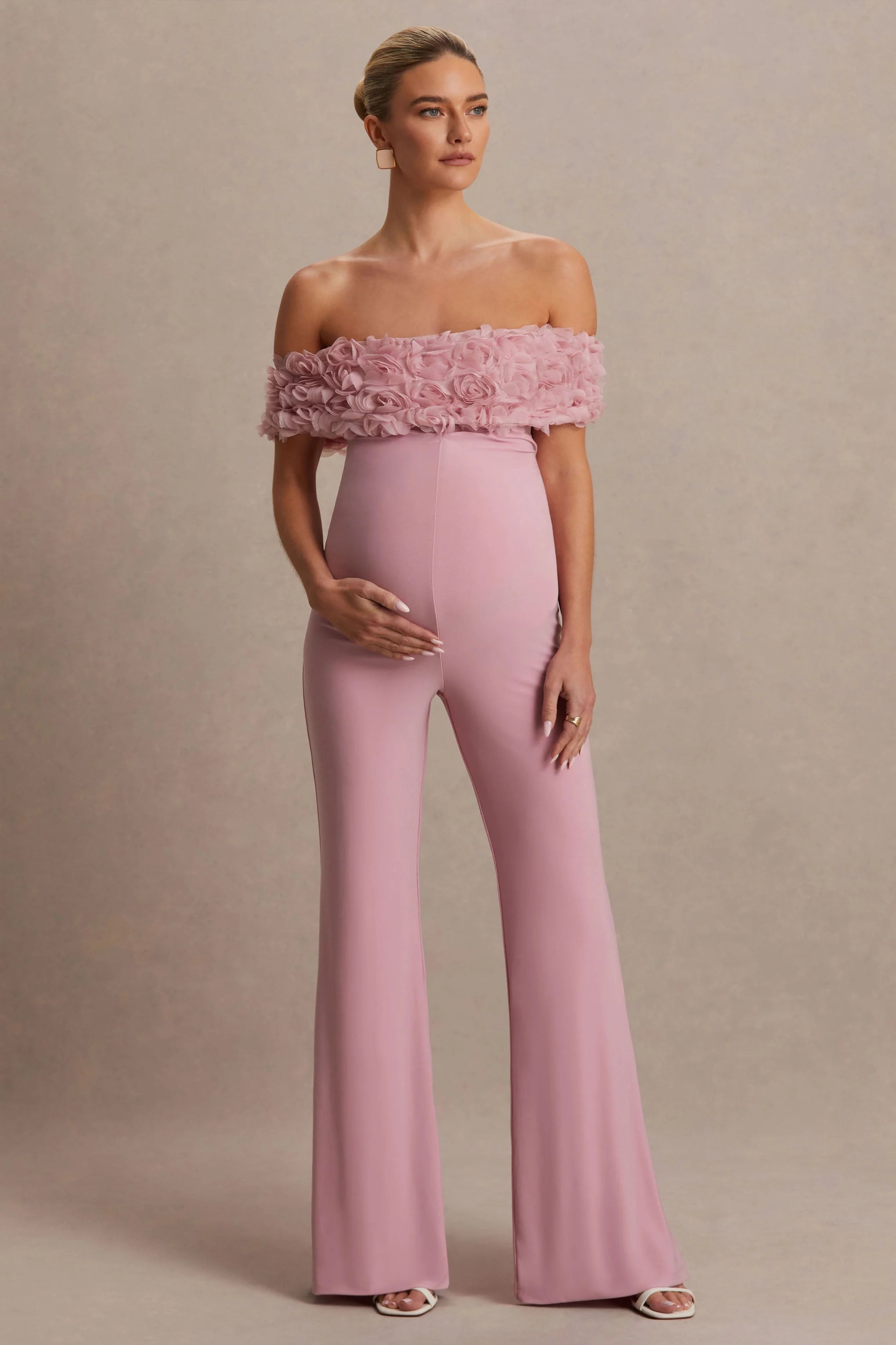 Capture the rooms attention with your elegance in Sallow. This jumpsuit is curated from a soft pink shade of our premium stretch jersey, designed to enhance your silhouette. The bardot neckline gracefully displays your decolletage whilst the corsage detailing adds a striking feminine edge. Finished with expertly placed ruched detailing, in this piece you will be flattered from all angles. Style with a glamorous up-do for the perfect baby shower outfit.