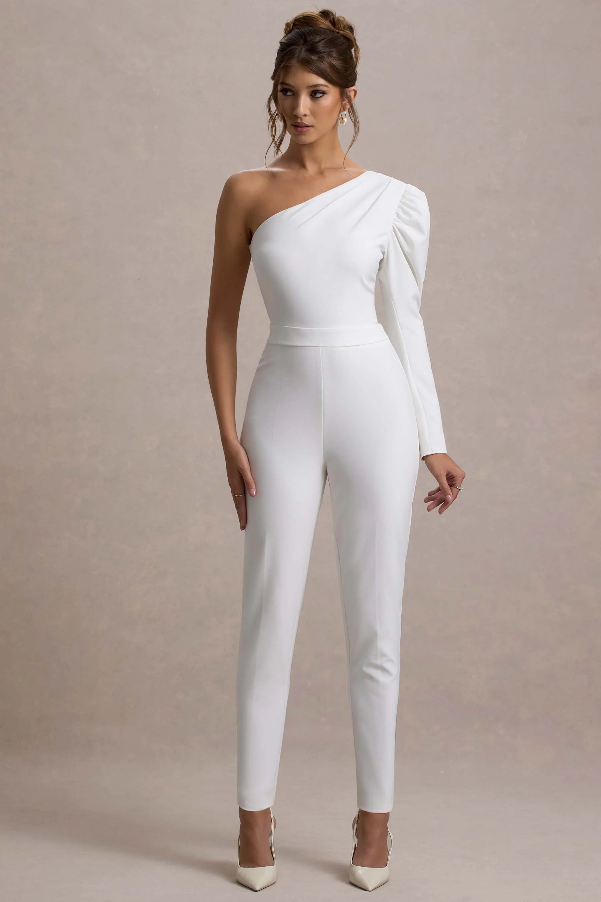 Effortlessly elegant, every wardrobe needs a staple like San Jose. Crafted in a timeless white shade of premium crepe, this tailored jumpsuit is detailed by an asymmetric neckline, single puff sleeve and straight legs. Elevate yours further with some bouncy curls and stilettos like Pluto.