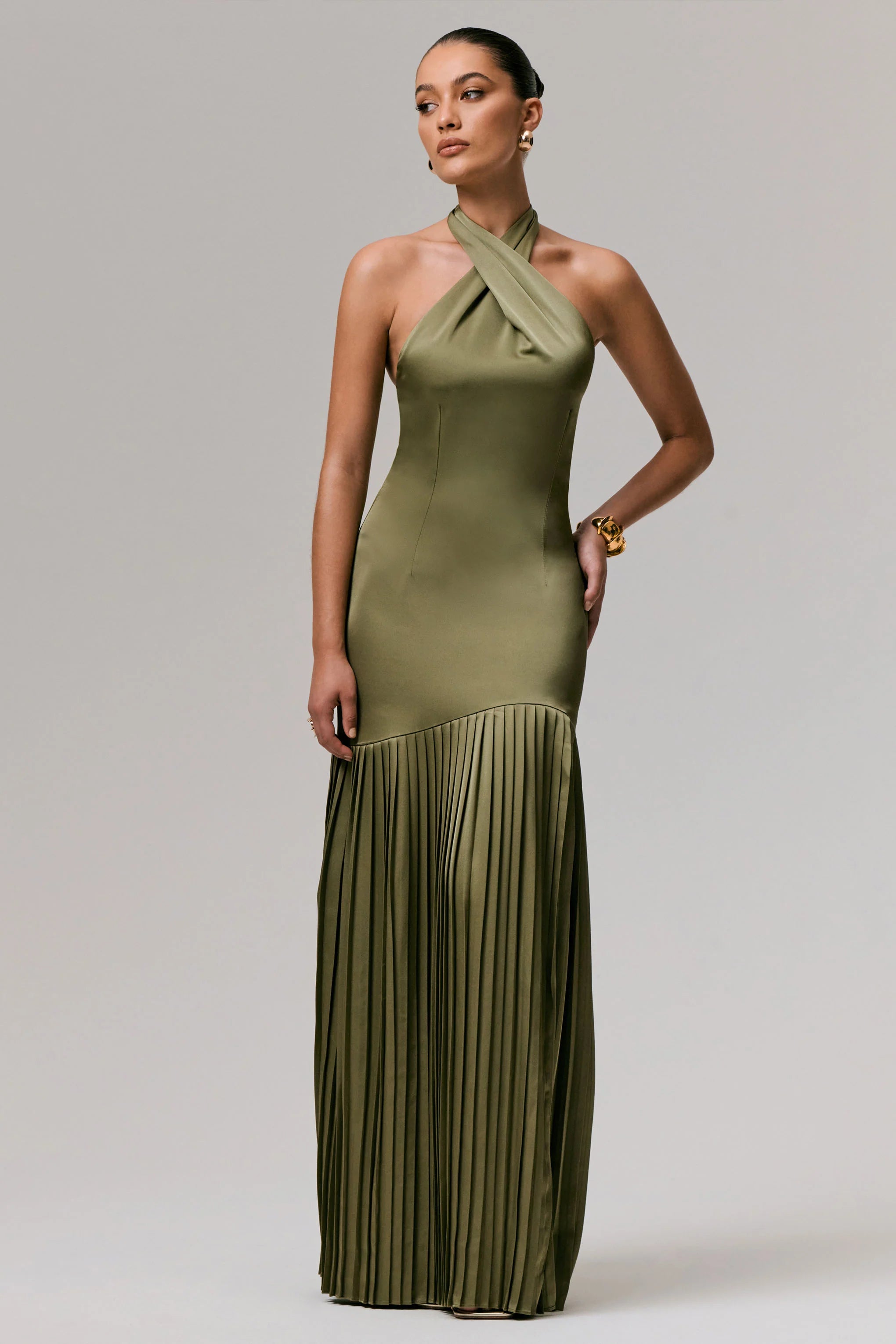 Sculpt your silhouette in our striking maxi, Sansa. Wrapped in a dreamy khaki satin, this floor-sweeper commands attention through its crossed halter neckline, plisse detailing and sultry split skirt. For a stunning bridesmaid look, we would style Sansa with some timeless golden earrings like Dreamer.