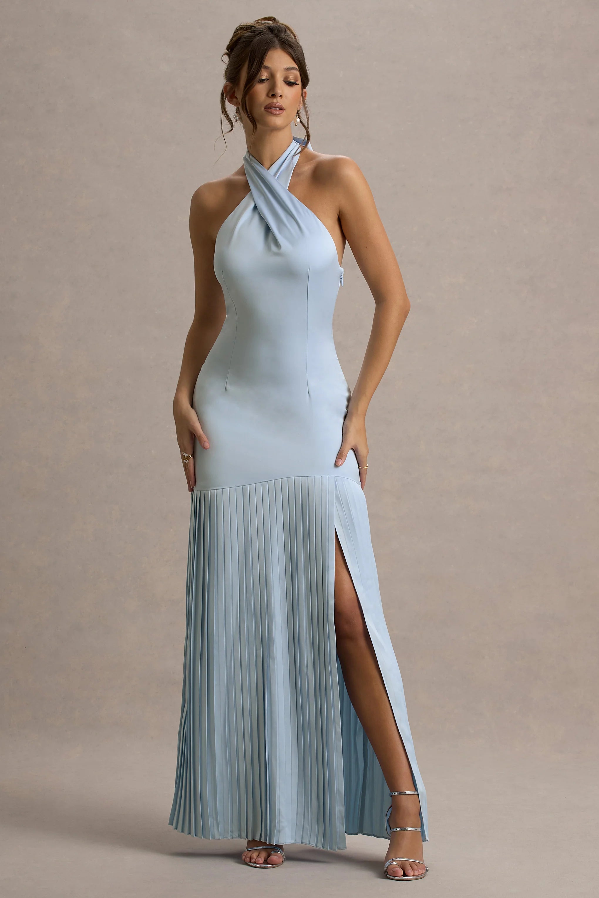 Sculpt your silhouette in our striking maxi, Sansa. Wrapped in a dreamy blue satin, this floor-sweeper commands attention through its crossed halter neckline, plisse detailing and sultry split skirt. For a stunning bridesmaid look, we would style Sansa with some timeless golden earrings like Dreamer.