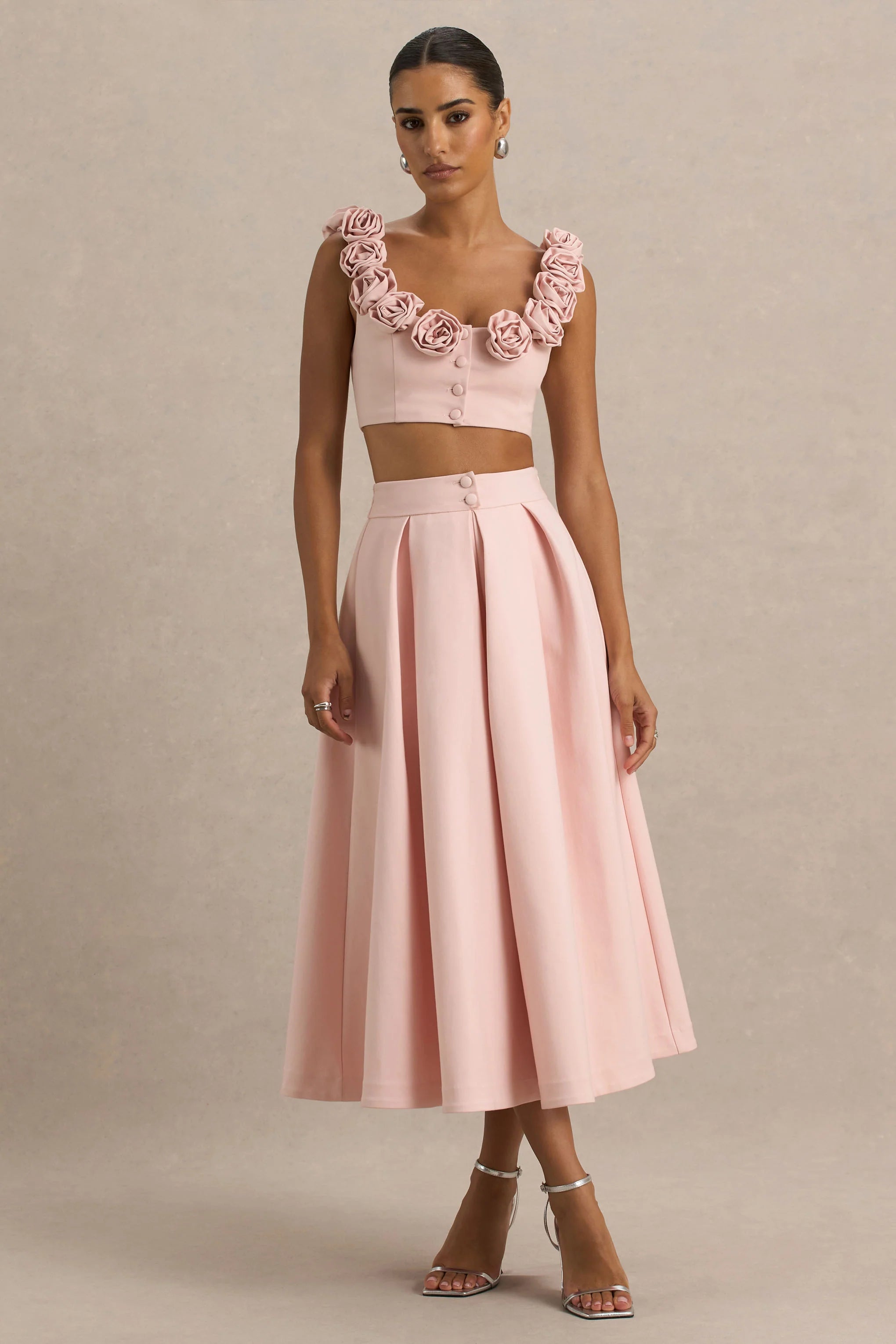 Exude timeless glamour and romantic charm in Sara. Crafted in a delicate baby pink hue of our premium cotton modal, this midi skirt is the perfect way to make a refined statement. This A-line piece provides a gorgeous silhouette that is finished with chic self covered buttons on the waist band. Style with sleek heels and gold accessories for a look that'll see you through all dressed up moments this season, from garden parties to elegant dinners.