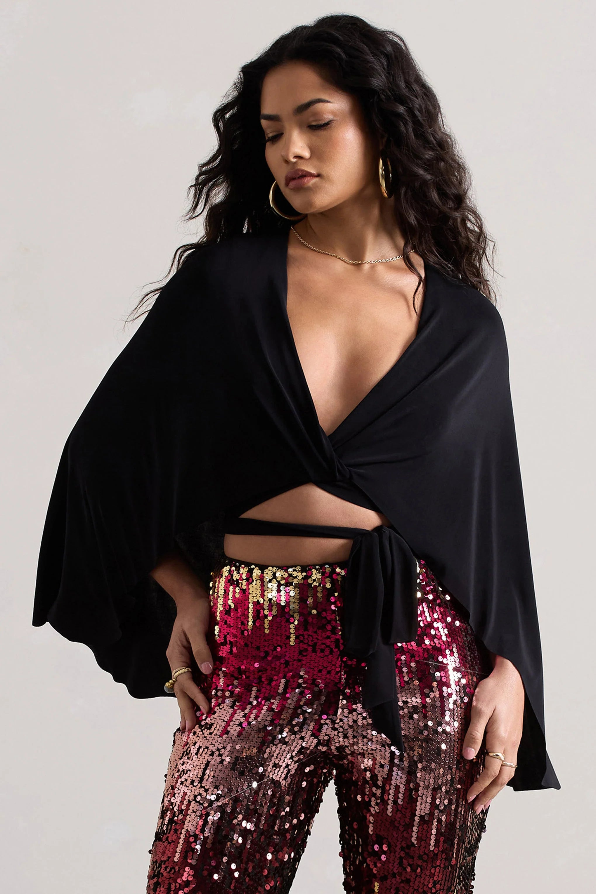 Look striking in Scorpio, our captivating black crop top for festival season. Arriving in a premium stretch jersey, Scorpio features a plunging neckline with a twisted wrap waist and flowing cape that creates effortless movement. Style yours with our Carnival trousers to get that ultimate festival glam.