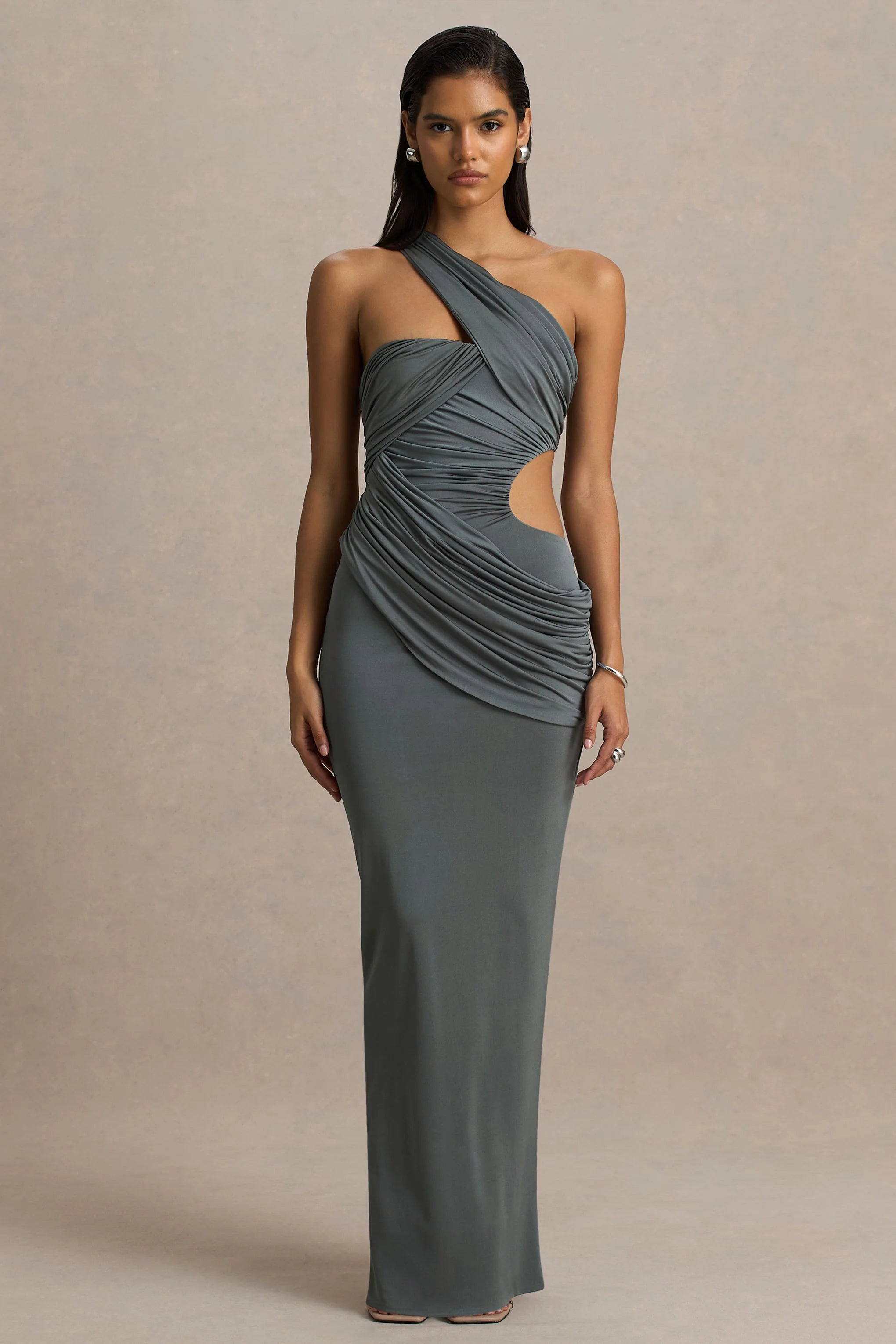 Make a statement in Serefine, a striking maxi dress that embodies bold glamour and modern elegance. Crafted from our premium disco jersey in a high-shine grey, this fabric catches the light with every movement while hugging the body in all the right places for a sculpted, radiant silhouette. The asymmetric neckline creates an eye-catching shape, balanced by a daring body cut-out that adds just the right amount of edge. The ruched wrap skirt drapes fluidly over the hips, creating a flattering hourglass effect. Perfect for evening soirées, red carpet moments, or anywhere you want to steal the spotlight.