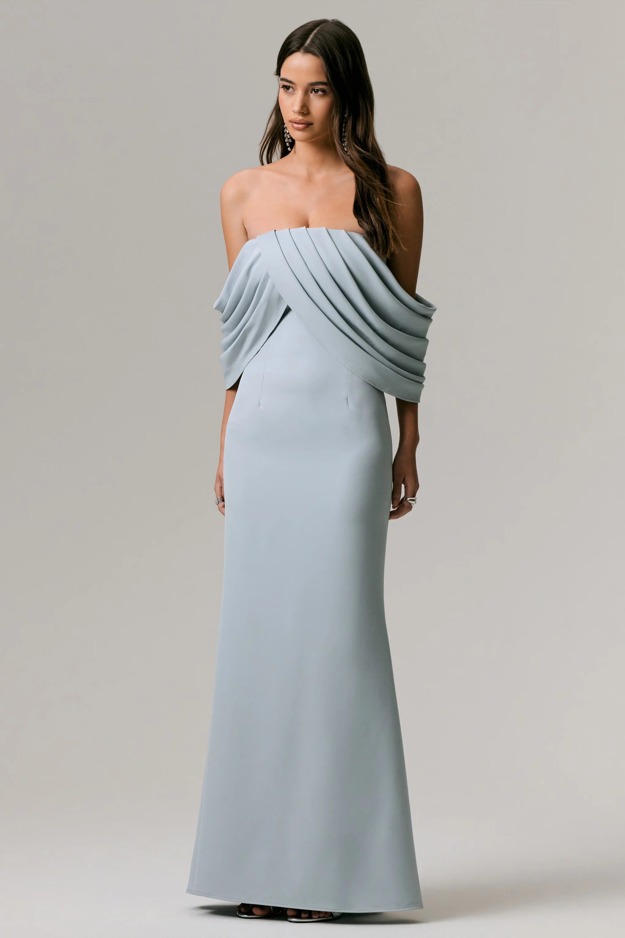 Step into timeless sophistication with Serene, a gown designed to leave a lasting impression. Crafted from a powder blue shade of our premium stretch chiffon and crepe, this maxi is the definition of graceful elegance. Featuring a romantic bardot neckline and draped sleeves, Serene flatters with every movement. The internal corset sculpts your silhouette for a flawless fit, making it the perfect choice for black-tie moments, bridesmaids, or any occasion that calls for timeless glamour.